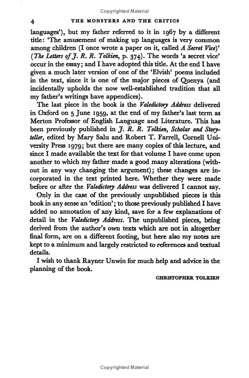 The pieces in this collection cover a period of nearly thirty years, beginning six years before the publication of The Hobbit, with a unique 'academic' lecture on his invention (calling it A Secret Vice) and concluding with his farewell to professorship, five years after the publication of The Lord of the Rings.