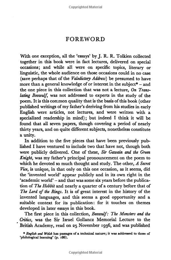 Also included in this volume is the lecture English and Welsh; the Valedictory Address to the University of Oxford in 1959; and a paper on Invented Languages red in 1931, with exemplification from poems in the Elvish tongues. Most famous of all is On Fairy-Stories, a discussion of the nature of fairy-tales and fantasy, which gives insight into Tolkien's approach to the whole genre.
