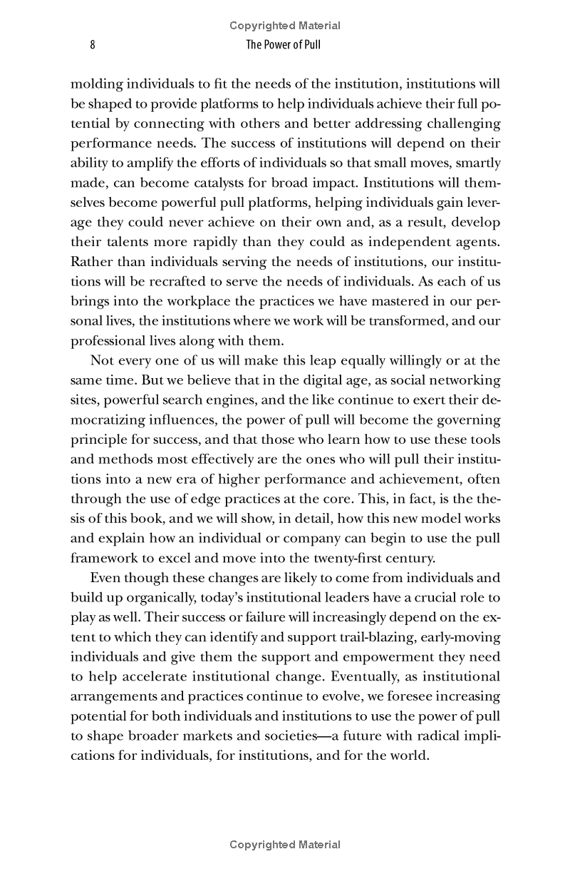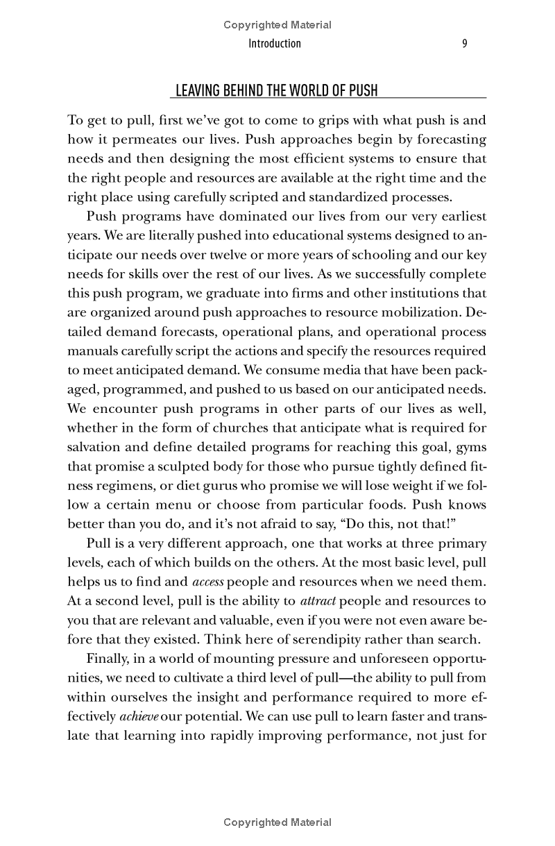 In a radical break with the past, information now flows like water, and we must learn how to tap into its stream. Individuals and companies can no longer rely on the stocks of knowledge that they've carefully built up and stored away. Information now flows like water, and we must learn how to tap into the stream. But many of us remain stuck in old practices- practices that could undermine us as we search for success and meaning. In this revolutionary book, three doyens of the Internet age, whose path-breaking work has made headlines around the world, reveal the adjustments we must make if we take these changes seriously. In a world of increasing risk and opportunity, we must understand the importance of pull . Understood and used properly, the power of pull can draw out the best in people and institutions by connecting them in ways that increase understanding and effectiveness. Pull can turn uncertainty into opportunity, and enable small moves to achieve outsized impact. Drawing on pioneering research, The Power of Pull shows how to apply its principles to unlock the hidden potential of individuals and organizations, and how to use it as a force for social change and the development of creative talent. The authors explore how to use the power of pull to: Access new sources of information Attract likeminded individuals from around the world Shape serendipity to increase the likelihood of positive chance encounters Form creation spaces to drive you and your colleagues to new heights Transform your organization to adapt to the flow of knowledge The Power of Pull is essential reading for entrepreneurs, managers, and anybody interested in understanding and harnessing the shifting forces of our networked world.