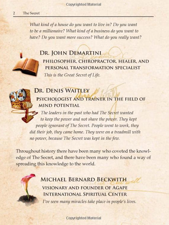 The Secret contains wisdom from modern-day teachers -- men and women who have used it to achieve health, wealth, and happiness. By applying the knowledge of The Secret, they bring to light compelling stories of eradicating disease, acquiring massive wealth, overcoming obstacles, and achieving what many would regard as impossible.