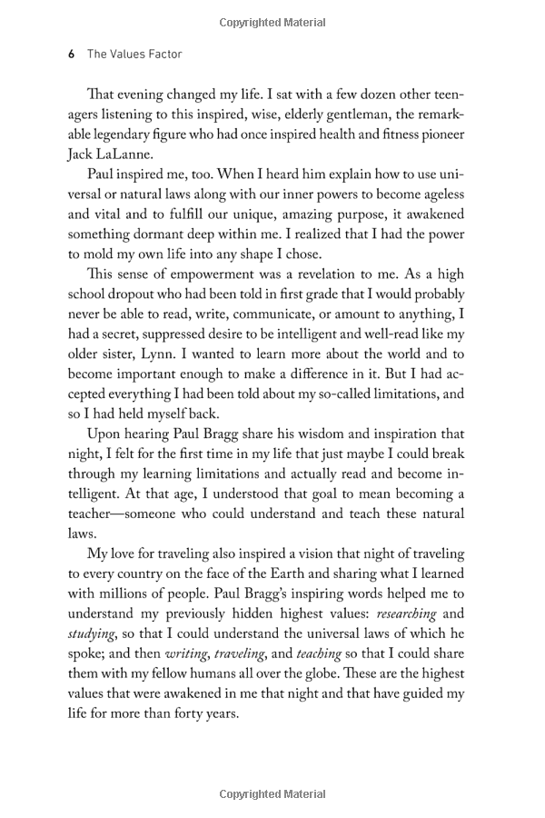 The Values Factor shows you how to create a life in which every minute can be inspiring and fulfilling. The first step is to identify what you find most meaningful the values in life that are most important to you. Once you understand your own unique values and align your life accordingly, you can achieve fulfillment in every aspect of your life: deepening your loving relationships, creating an inspiring career, establishing financial freedom, and tapping into a rich spiritual life.