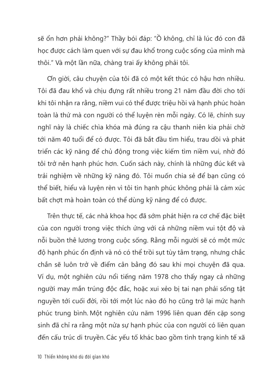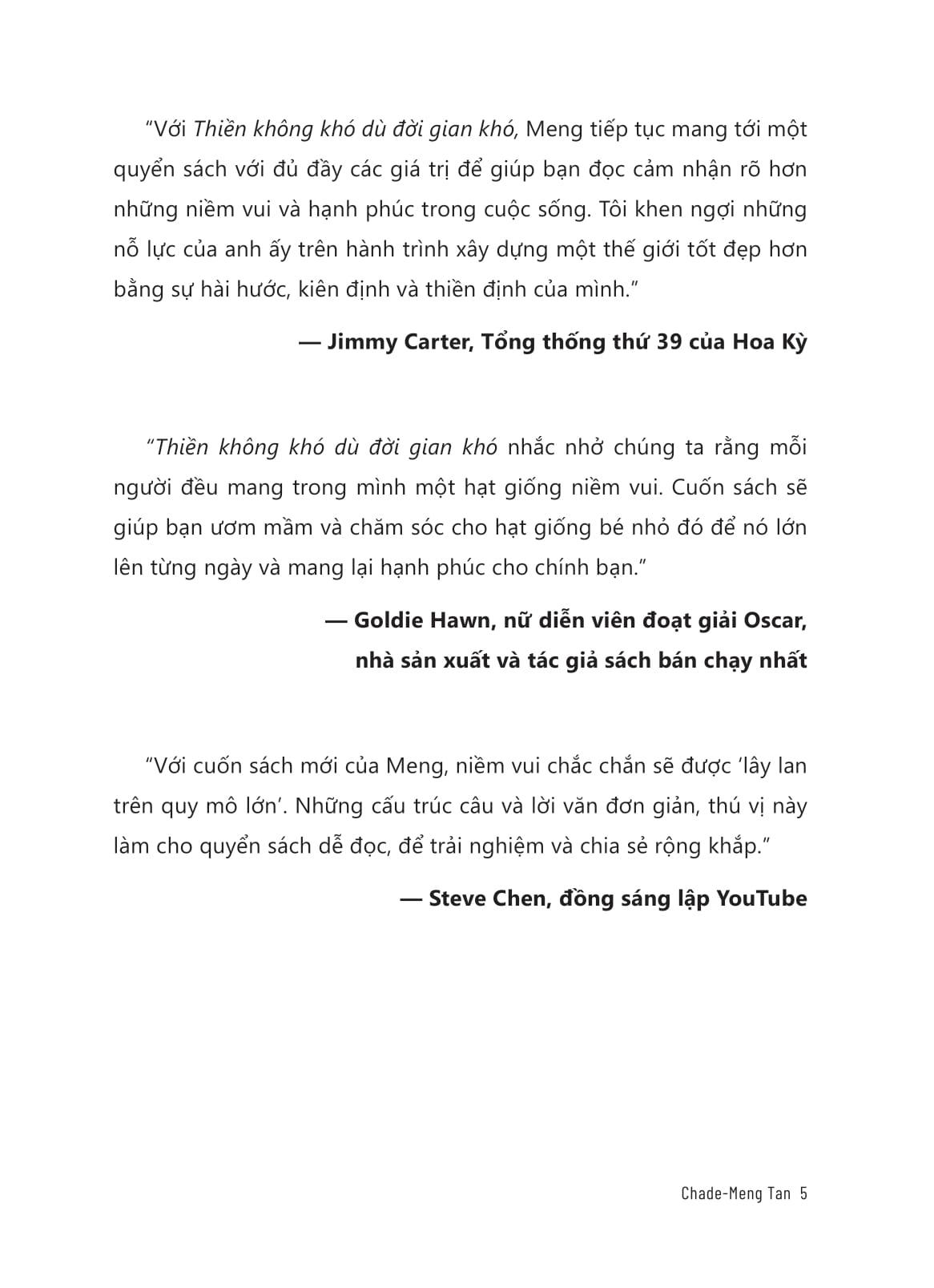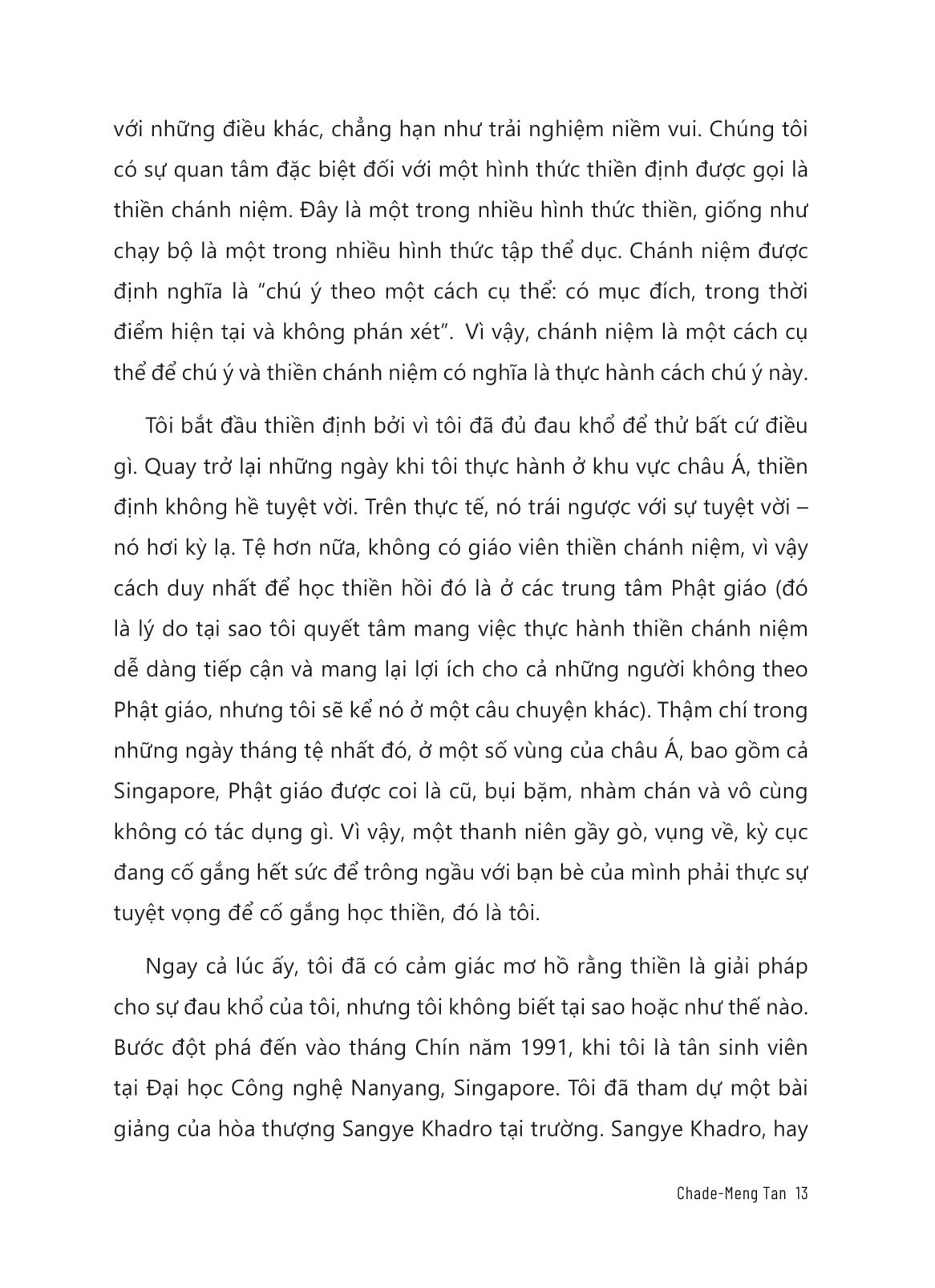 Thiền Không Khó Dù Đời Gian Khó - Dùng Sự Im Lặng Để Thay Đổi Thế Giới “Mất bao lâu để cảm nhận được những lợi ích của thiền định? Một hơi thở! Chỉ một hơi thở mà thôi.” Bởi niềm vui thì không cần cố sức, nên bước đầu tiên tiến đến với thiền định là thư giãn, thả lỏng và buông bỏ hết chấp niệm. Mọi thứ bắt đầu từ không: không có nơi nào để đi, không có gì để làm, không có mục tiêu để đạt được. Điều duy nhất bạn cần là ở đây, bây giờ, chú ý vào từng nhịp thở. Với tâm niệm “THIỀN KHÔNG KHÓ DÙ ĐỜI GIAN KHÓ”, hãy dẫn lối tâm trí bạn tập trung vào hiện tại, học cách tận hưởng trọn vẹn từng giây phút để nhận thấy được những vẻ đẹp giản dị mà bấy lâu nay ta thường bỏ quên. Tựa sách cũng là phần tiếp theo của “Search Inside Yourself” (Tạm dịch: “Tìm m.ình trong chính m.ình”) – đứng đầu danh sách bán chạy nhất của New York Times, dựa trên khóa học rất phổ biến mà Chade-Meng Tan thiết kế để giúp các đồng nghiệp của m.ình tại Google giảm căng thẳng và tăng cường sức khỏe tổng thể, nâng cao sự tập trung và sáng tạo, thêm phần lạc quan và kiên cường, xây dựng các mối quan hệ trọn vẹn và có được những nụ cười vui vẻ khi tham gia. Một số lời khen tặng dành cho tác phẩm: “Với ‘Thiền không khó dù đời gian khó’, Meng tiếp tục mang tới một quyển sách với đủ đầy các giá trị để giúp bạn đọc cảm nhận rõ hơn những niềm vui và hạnh phúc trong cuộc sống. Tôi khen ngợi những nỗ lực của anh ấy trên hành trình xây dựng một thế giới tốt đẹp hơn bằng sự hài hước, kiên định và thiền định của m.ình.” — Jimmy Carter, Tổng thống thứ 39 của Hoa Kỳ “Thiền không khó dù đời gian khó nhắc nhở chúng ta rằng mỗi người đều mang trong m.ình một hạt giống niềm vui. Cuốn sách sẽ giúp bạn ươm mầm và chăm sóc cho hạt giống bé nhỏ đó để nó lớn lên từng ngày và mang lại hạnh phúc cho chính bạn.” — Goldie Hawn, nữ diễn viên đoạt giải Oscar, nhà sản xuất và tác giả sách bán chạy nhất “Với cuốn sách mới của Meng, niềm vui chắc chắn sẽ được ‘lây lan trên quy mô lớn’. Những cấu trúc câu và lời văn đơn giản, thú vị này làm cho quyển sách dễ đọc, để trải nghiệm và chia sẻ rộng khắp.” — Steve Chen, đồng sáng lập YouTube VỀ TÁC GIẢ: “Thiền sư của thung lũng Silicon.” — CNBC Chade-Meng Tan (thường được gọi thân mật là “Meng”) là một trong những kỹ sư đầu tiên tại Google và hiện đã nghỉ hưu, nơi ông có chức danh chính thức là “Jolly Good Fellow (Which nobody can deny)” – Tạm dịch: Vui vẻ hòa đồng (Mà không ai có thể phủ nhận). Một trong những dự án chính của Chade-Meng Tan tại Google là “Search Inside Yourself” – một khóa học về trí tuệ cảm xúc dựa trên chánh niệm. Là một người thiền định nhiệt thành, ông luôn cống hiến hết m.ình để thúc đẩy Hòa bình, Tự do, Khai sáng và Hạnh phúc.