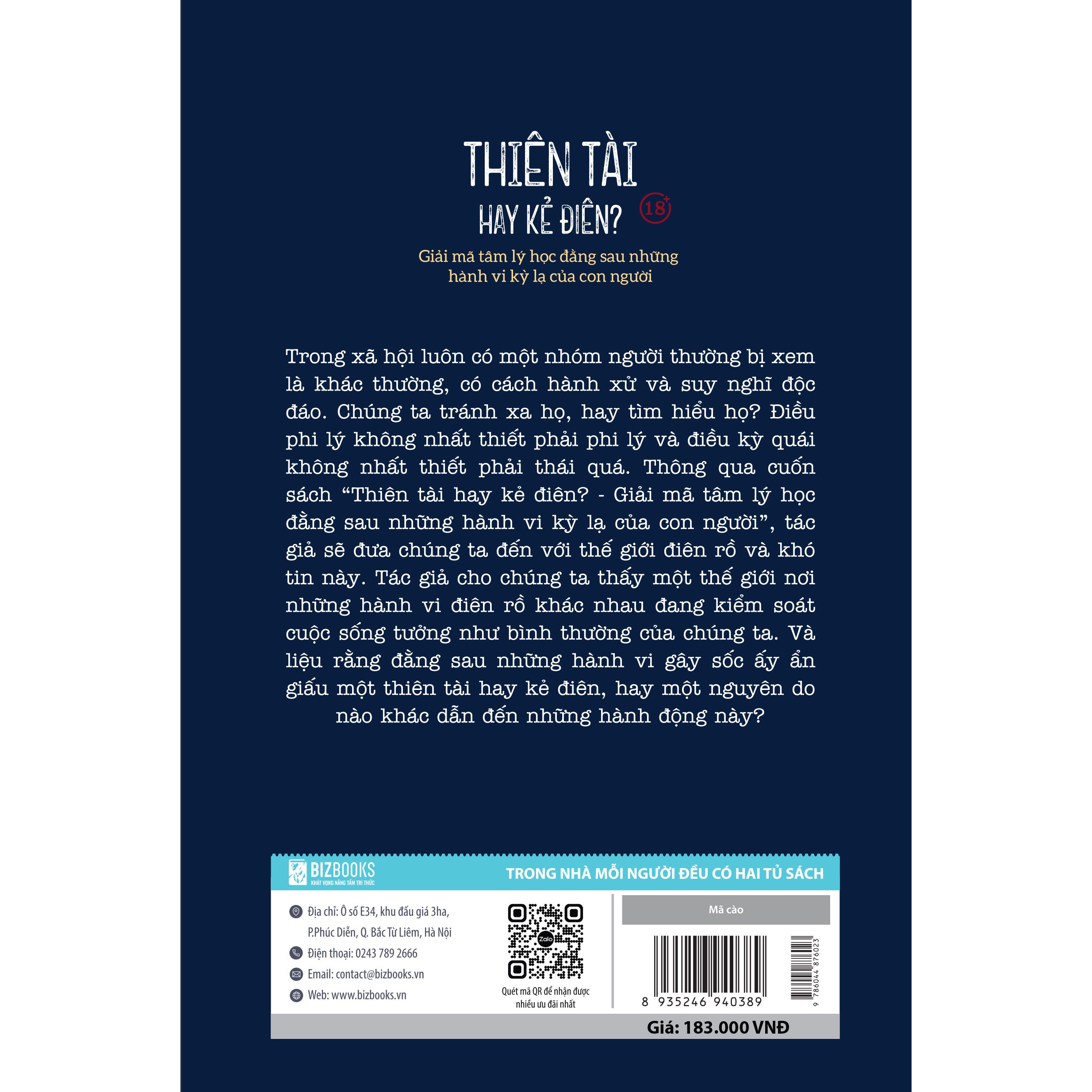 Thiên tài hay kẻ điên: Từ khác lạ “có thể chấp nhận” đến khiến người khác phải “rùng mình” Từ những hành động khác lạ ở mức độ “có thể chấp nhận” đến những hành vi điên rồ đến mức đáng bị lên án. Bạn nghĩ rằng cuốn sách này chỉ dừng ở những hội chứng như rối loạn ám ảnh cưỡng chế, sợ không gian hẹp, ám ảnh xã hội, sợ lỗ tròn…?