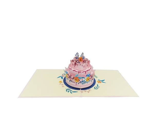 Mang đến sự bất ngờ và ấn tượng với thiệp 3D Pop Up bánh kem sinh nhật 3 tầng. Khi mở ra, chiếc bánh kem màu hồng trang trí hoa văn rực rỡ bật nổi