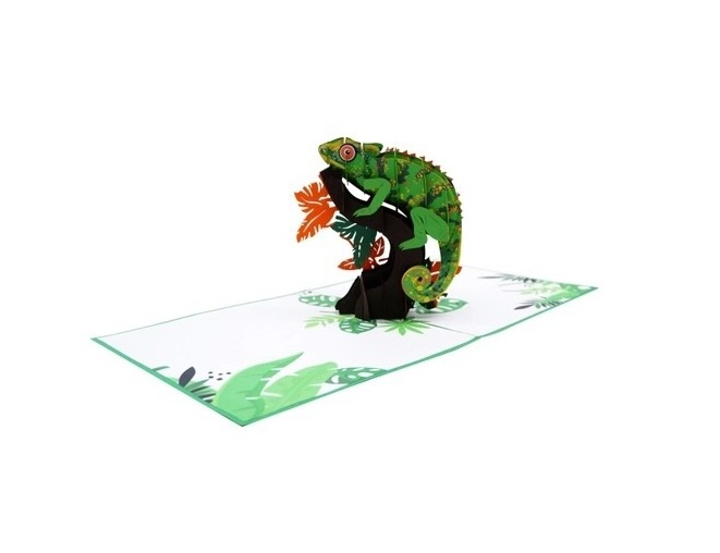 Khác biệt và độc đáo, thiệp 3D tắc kè hoa nghệ thuật mang lại sự bất ngờ thú vị cho người nhận. Khi mở thiệp, hình ảnh chú tắc kè nhiều màu sắc nổi bật