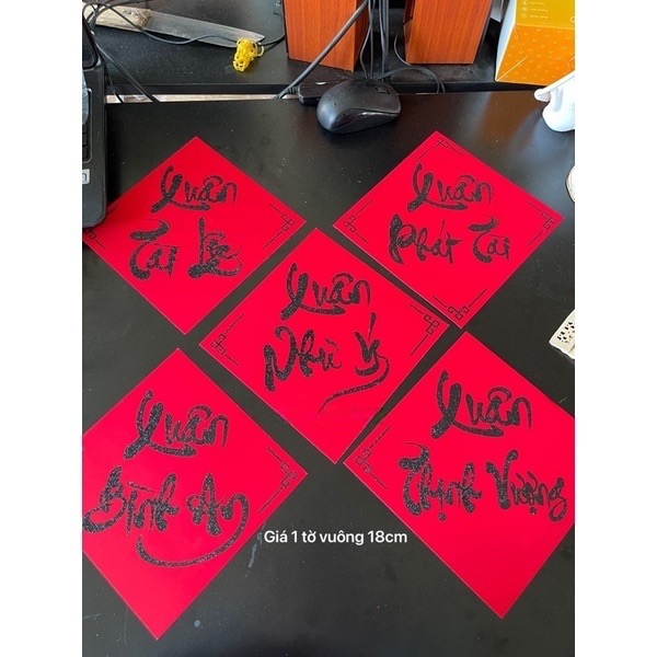 Thiệp, chữ, lixi, hoa treo tranng trí Tết.