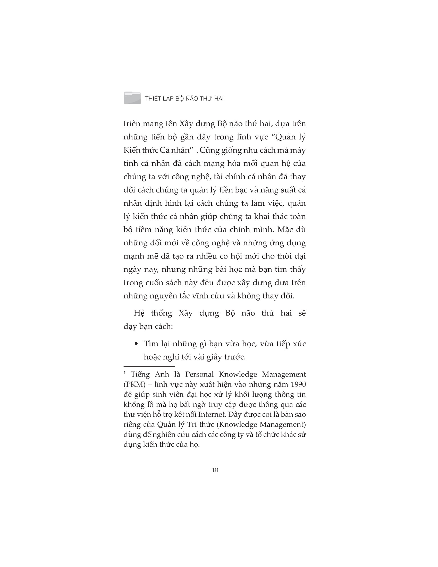 Cuốn sách Buiding a Second Brain - Thiết lập bộ não thứ hai làmột cách tiếp cận mang tính cách mạng, một bản hướng dẫn, chỉ ra các phương pháp để bạn có thể dễ dàng tạo hệ thống dữ liệu công việc cá nhân để quản lý kiến thức. Hệ thống này chính là kho lưu trữ kỹ thuật số có tổ chức và đáng tin cậy, chứa các ý tưởng, ghi chú sáng tạo có giá trị nhất, được đồng bộ hóa trên tất cả các thiết bị và nền tảng của bạn. Bộ não thứ hai mang đến cho bạn sự tự tin để giải quyết các dự án quan trọng nhất và các mục tiêu đầy tham vọng của mình.