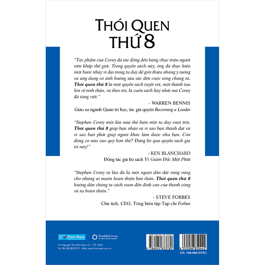 “Tác phẩm của Covey đã tác động đến hàng chục triệu người trên khắp thế giới. Trong quyển sách này, ông đã thực hiện một bước nhảy vĩ đại trong tư duy để giới thiệu với chúng ta những ý tưởng và ứng dụng có ảnh hưởng sâu sắc đến cuộc sống chúng ta. Thói Quen Thứ 8 là một quyển sách tuyệt vời, một thành tựu lớn về tinh thần, và theo tôi, là cuốn sách hay nhất mà Covey đã từng viết.” - WARREN BENNIS, Giáo sư ngành Quản trị học, tác giả quyển Becoming a Leader.