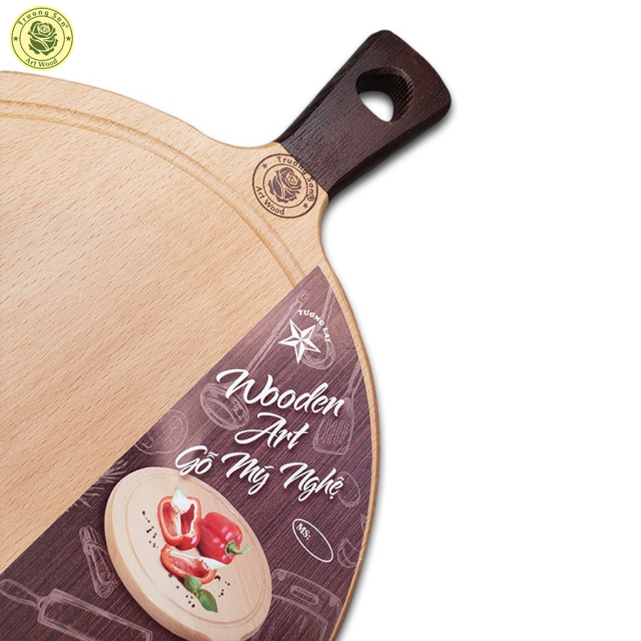 Thớt Gỗ Tròn Tay Cầm được lựa chọn các khối gỗ Beech rắn tốt, độ cứng cao, khi chặt sẽ hạn chế để lại vết hằn hay dao bị dính lại trên thớt.