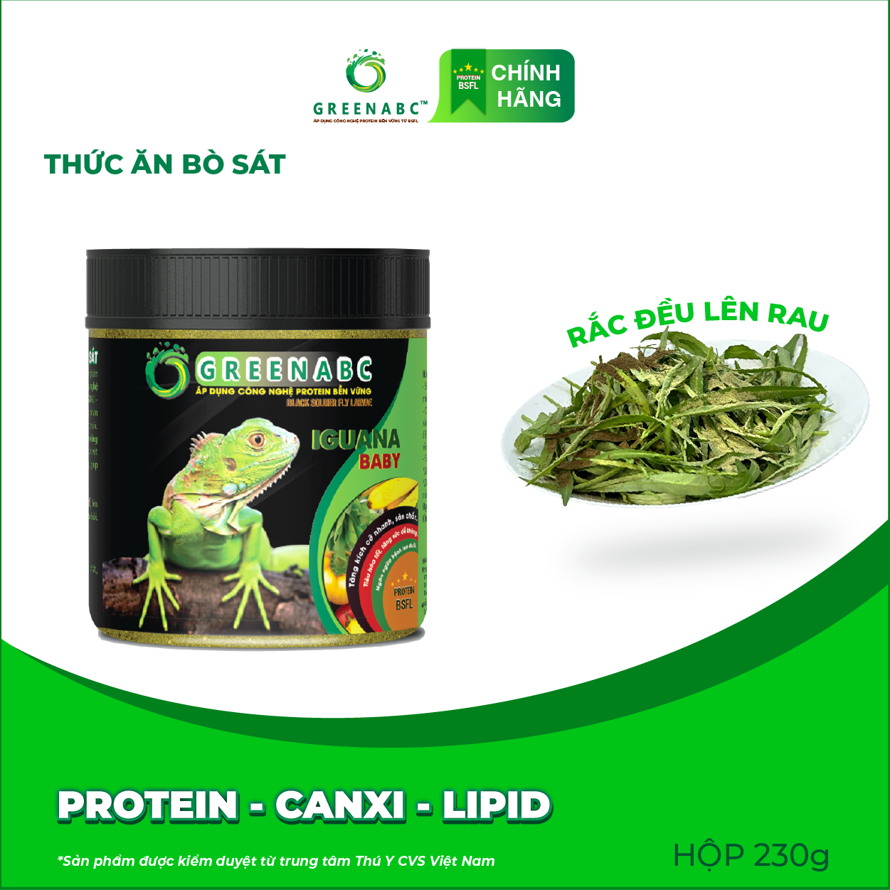 THỨC ĂN BÒ SÁT - BỔ SUNG DINH DƯỠNG PROTEIN, CANXI, LIPID GREENABC là thức ăn cao cấp dành cho các loại bò sát: IGUANA, BEARDED DRAGON, LEOPARD GECKO. Đặc biệt sản phẩm GREENABC được