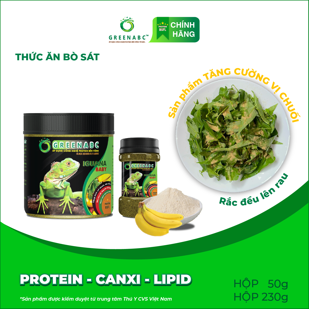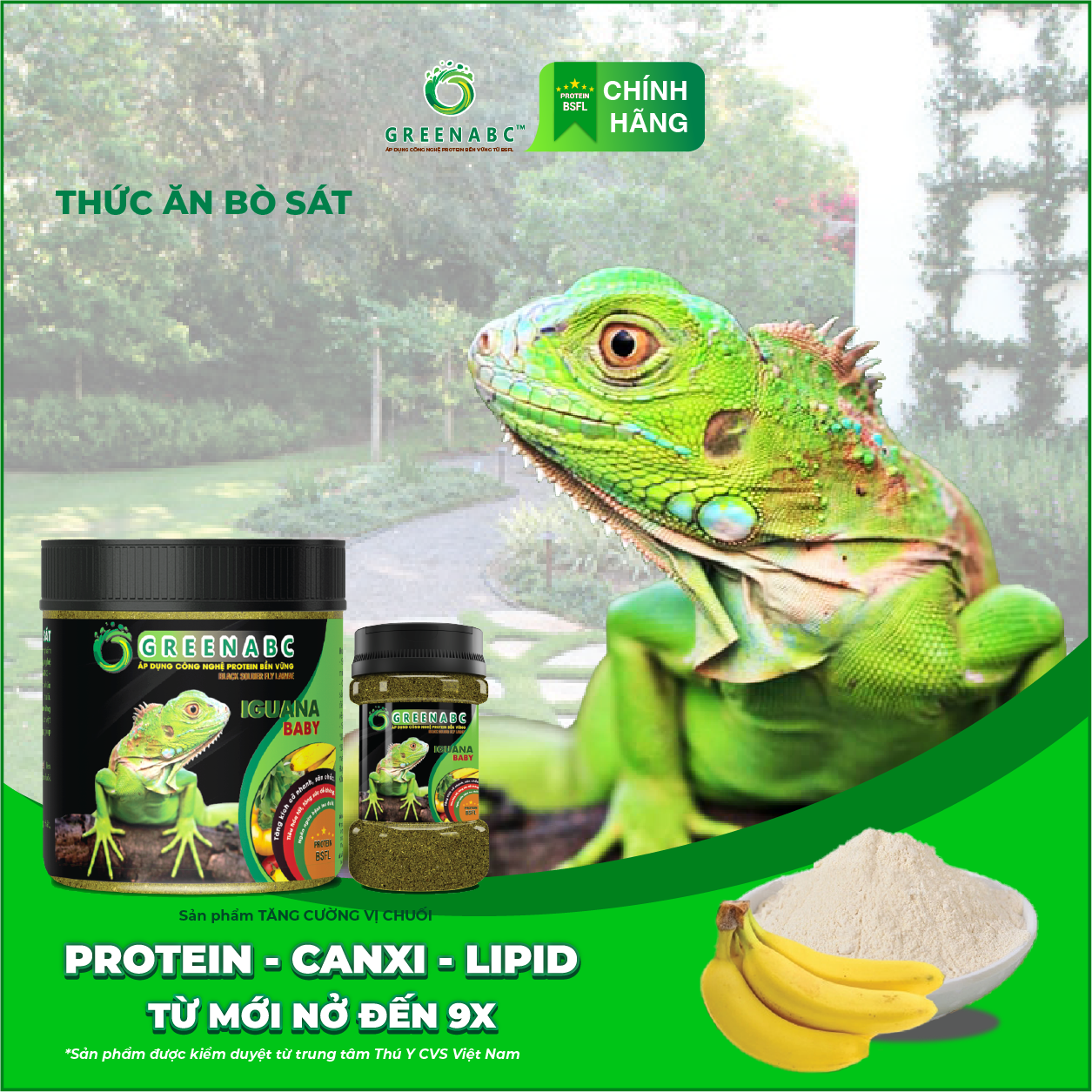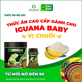 GREENABC - THỨC ĂN IGUANA BABY VỊ CHUỐI - Rồng Nam Mỹ Baby vị Chuối từ mới nở đến 9x.  GREENABC là thức ăn cao cấp dành cho Iguana Baby - Rồng Nam Mỹ Baby Đặc biệt sản phẩm GREENABC được sản xuất theo phương pháp Áp dụng công nghệ PROTEIN bền vững từ bột đạm G.Meal rất giàu PROTEIN – CANXI – LIPID có trong BSFL, đã được Mỹ (AAFCO) và EU chấp nhận đưa vào công thức cho ngành sản xuất thức ăn dành cho vật nuôi. Sản phẩm GREENABC cung cấp các giá trị dinh dưỡng bền vững cho Iguana với sự kết hợp 80% thành phần có nguồn gốc thực vật và 20% thành phần có nguồn gốc động vật từ côn trùng, giúp cho Iguana Baby:      + Lột da thường xuyên, tăng kích cỡ nhanh, lên màu đẹp.      + Với hàm lượng Canxi 100% nguyên chất có trong BSFL giúp gai bung, đều, ngăn ngừa các bệnh thường gặp như teo đuôi, MBD, sạn,      + Kích thích khứu giác, tăng cường vị giác, giúp Iguana ăn ngon miệng hơn. Đặc biệt với hương thơm tự nhiên, Greenabc kích thích khứu giác của các Iguana Abino T-, giúp các bé ăn tốt hơn.       + Tiêu hóa tốt, cơ thể hấp thụ toàn bộ dưỡng chất cần thiết, giúp cơ thể phát triển toàn diện.      + Cơ thể săn chắc, khỏe mạnh.      + Giảm thiểu mùi hôi của phân và cơ thể. IGUANA BABY có 3 loại combo giúp IGUANA phát triển toàn diện cơ thể và Quý Khách Hàng tiết kiệm chi phí Combo 1: Combo 2: Combo 3: Ghi chú: Khi sử dụng combo Iguana Baby 3, KHÔNG CẦN BỔ SUNG THÊM CANXI VÀ D3 cho Iguana, vì trong combo Iguana Baby 3 đã đầy đủ lượng Canxi cho Igu phát triển. Quý khách hàng sẽ SIÊU TIẾT KIỆM CHI PHÍ cho việc chăm sóc cho Iguana.  Thành phần dinh dưỡng và hướng dẫn sử dụng: