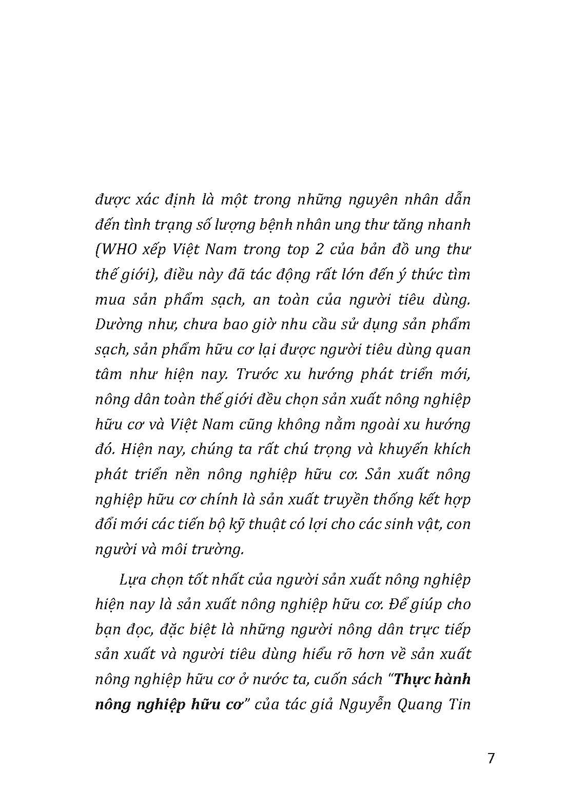 Mua tại TiktokLựa chọn tốt nhất của người sản xuất nông nghiệp hiện nay là sản xuất nông nghiệp hữu cơ. Để giúp cho bạn đọc, đặc biệt là những người nông dân trực tiếp sản xuất và người tiêu dùng hiểu rõ hơn về sản xuất nông nghiệp hữu cơ ở nước ta, cuốn sách “Thực hành nông nghiệp hữu cơ” của tác giả Nguyễn Quang Tin cung cấp những kiến thức cơ bản nhất về nông nghiệp hữu cơ và biện pháp kỹ thuật trong thực hành nông nghiệp hữu cơ. Cuốn sách được xây dựng trên nền tảng kinh nghiệm và thành tựu của tác giả sau nhiều năm hoạt động trong lĩnh vực nông nghiệp sinh thái, nông nghiệp bảo tồn.