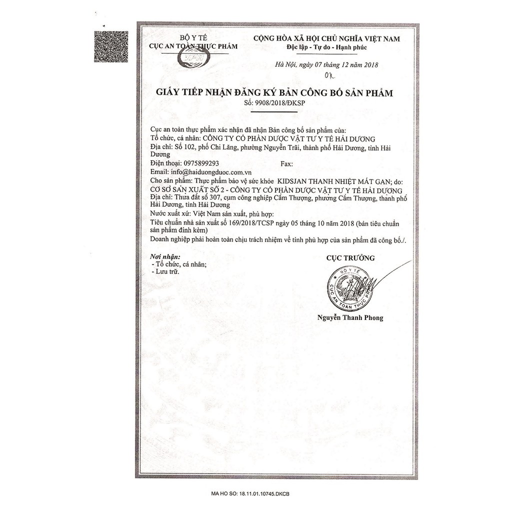 Chịu trách nhiệm chất lượng sản phẩm: CÔNG TY CỔ PHẨM DƯỢC VẬT TƯ Y TẾ HẢI DƯƠNG
