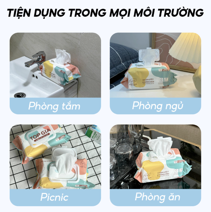 - Khăn ướt với kích thước tiện lợi dễ dàng sử dụng trong nhà bếp, nhà tắm, phòng khách, phòng ngủ.