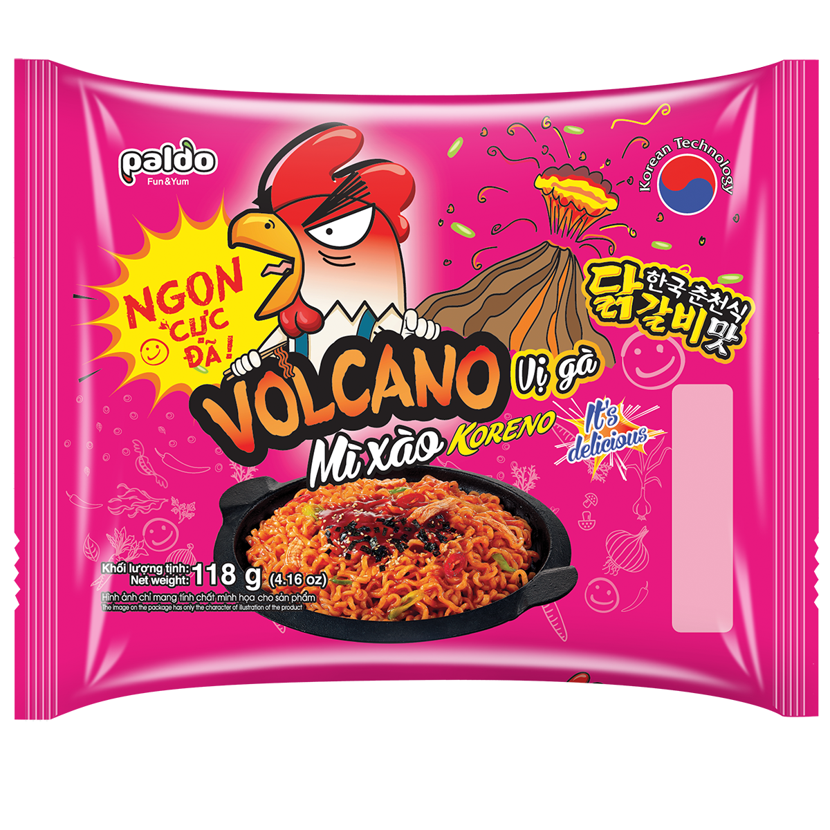 - Mỳ Xào Vị Gà Koreno Volcano có thành phần nguyên liệu an toàn cho sức khỏe. Hương vị thơm ngon, hấp dẫn. Đóng gói tiện lợi, hợp vệ sinh.