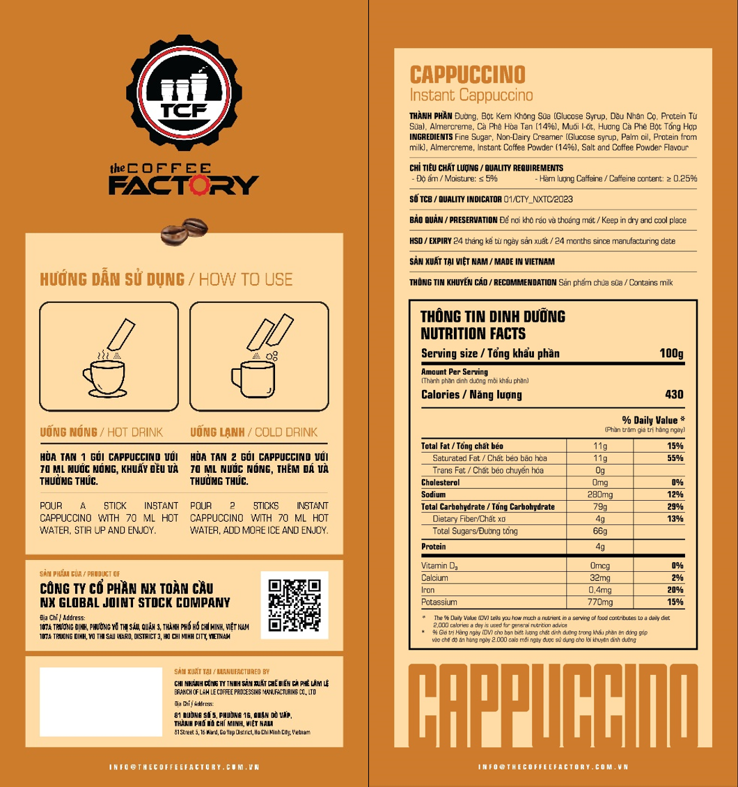 Tên sản phẩm: Cà phê Cappuccino hòa tan The Coffee Factory (Hộp 15 gói x 16g)