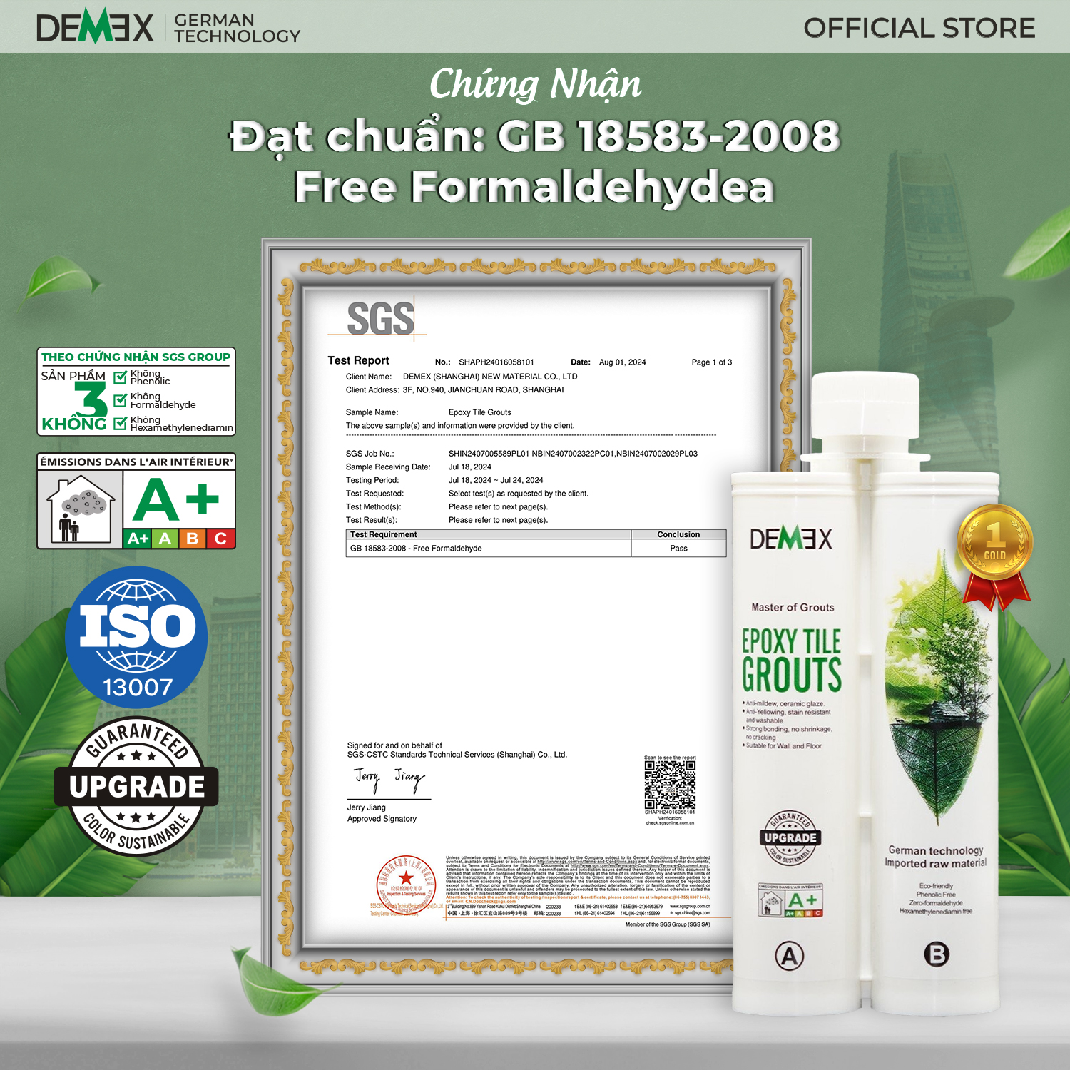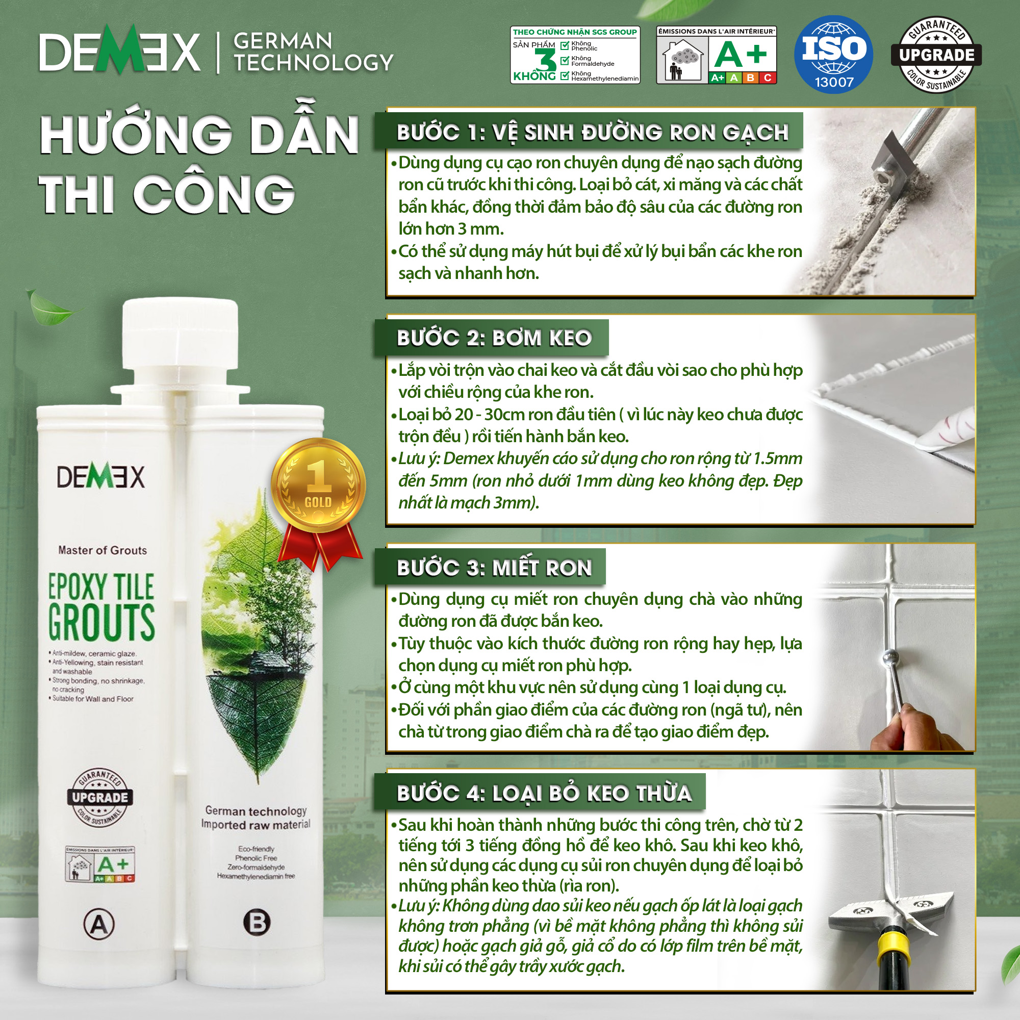 Keo Chà Ron DEMEX được sử dụng trong công trình và nhà ở, là loại keo epoxy hai thành phần dùng để trám khe nối gạch hay các khe hở trong xây dựng. Keo Chà Ron không chứa 3 chất hóa học gây ung thư, bảo vệ môi trường. Đạt chứng chỉ A+ của Pháp.   SẢN PHẨM KEO CHÀ RON DEMEX 3 KHÔNG DUY NHẤT TẠI VIỆT NAM - KHÔNG Phenolic – Hoàn toàn không chứa các chất gây kích ứng da, mắt và đường hô hấp, bảo vệ sức khỏe toàn diện. - KHÔNG Formaldehyde – Đảm bảo không gây ô nhiễm không khí, giảm thiểu nguy cơ ung thư và ảnh hưởng xấu đến khả năng sinh sản nam giới. - KHÔNG Hexamethylenediamine – Ngăn ngừa các phản ứng dị ứng và bảo vệ hệ hô hấp khỏi các tác động tiêu cực.   Thông tin sản phẩm: - Dung tích: 400gr - Màu sắc: 17 màu - Diện tích thi công: Khoảng 23m đường ron mạch    Công dụng sản phẩm: - Keo chà ron DEMEX dùng để chít mạch khi ốp lát các loại gạch Ceramic, gạch sứ porcelain. - Áp dụng cho ốp tường và lát sàn, keo chà ron còn có thể dùng để chít các mạch xung quanh bếp, bồn cầu, lavabo, bồn tắm, tường.   Hướng dẫn sử dụng:   Để đạt hiệu quả tốt nhất, quý khách cần sử dụng kèm bộ dụng cụ keo chít mạch chuyên dụng (xem trong phần sản phẩm của DEMEX).  Chất lượng cam kết: DEMEX Việt Nam cam kết tất cả sản phẩm đều đạt chuẩn chất lượng. Trong trường hợp sản phẩm có lỗi, xin vui lòng liên hệ qua chatbox để được đổi trả sản phẩm và hoàn tiền nếu không đúng cam kết.