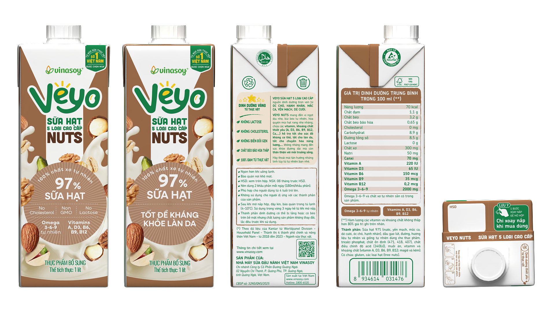 Mua tại TiktokVeyo sữa hạt 05 loại cao cấp nguồn dinh dưỡng trọn vẹn từ Óc chó, Hạnh nhân, Mắc ca, Yến Mạch, Dẻ cười. Mang đến vị ngọt dịu nhẹ, bùi béo tự nhiên, hòa quyện mùi hạt rang nhẹ nhàng, chứa các vitamin, khoáng chất tthiết yếu (A, D3, B6, B9, B12, Ca,...) hỗ trợ tốt cho sức đề kháng cơ thể, tốt cho làn da, tốt cho chuyển hóa năng lượng,... không những mang đênsức khỏe đường dài mà còn thân thiện với môi trường sống. HỘP 1 LÍT MỚI - CHIỀU MỌI Ý THÍCH, THỎA SỨC SÁNG TẠO