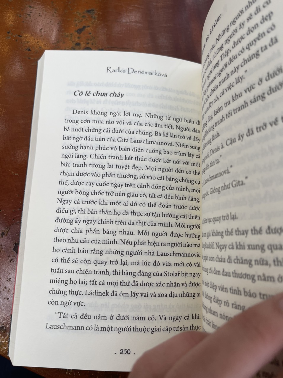 Liệu bà có thể đòi lại công lí sau những hành động tàn bạo mình từng trải qua? Những sai trái trong quá khứ liệu có trở nên đúng? Gita là nạn nhận của phân biệt dòng máu, nạn bài trừ người Semit, định kiến chính trị cũng như đổ lỗi cộng đồng. Đây là một câu chuyện đau lòng, truyền tải một thảm kịch điển hình hậu chiến. Cuốn tiểu thuyết thứ hai của Radka Denemarkova đã giành giải Magnesia Litera ở hạng mục hư cấu, giải văn chương danh giá nhất của Séc năm 2007. Một vở kịch gây xôn xao dư luận dựa trên cuốn tiểu thuyết đã được công diễn giai đoạn 2010-2012 tại Nhà hát Svanda ở Prague. Vở kịch đã làm dấy lên những tranh luận sôi nổi trong công chúng về chủ đề trục xuất hậu chiến đầy nhạy cảm và tam giác Đức – Séc - Do Thái trong quan hệ chính trị.
