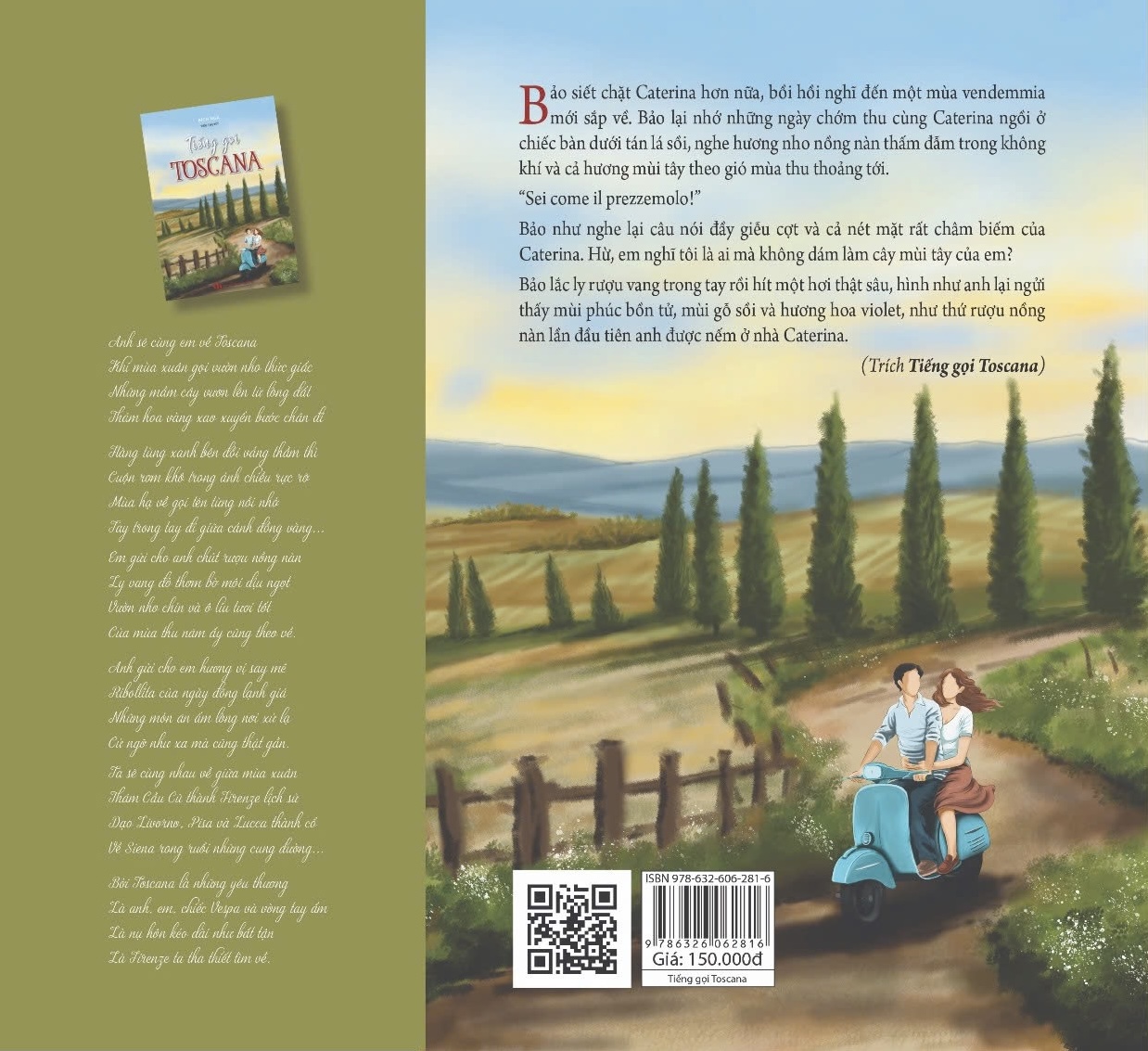 Xoay quanh hai nhân vật chính là Bảo và Caterina, tác phẩm như một bản tình ca xuyên biên giới với rất nhiều chuyến đi và trải nghiệm ẩm thực. Toscana là một vùng đất thơ mộng thuộc miền Trung nước Ý với những cánh đồng đẹp như tranh vẽ cùng hàng cipresso uốn lượn trên sườn đồi, rất nổi tiếng về đặc sản rượu vang, ô liu và nền ẩm thực đậm chất truyền thống. Thủ phủ vùng Toscana là thành phố Firenze, nơi được xem là cái nôi của nghệ thuật Phục hưng. Sẽ có thật nhiều trang viết về thành phố Firenze bình yên và cổ kính, những ngày đi về miền quê Siena hay cảnh sinh hoạt ở trang trại nho vùng Toscana, còn có những món ăn ngon mang linh hồn xứ sở... Trong tiếng Anh, Toscana được gọi là Tuscany còn Firenze là Florence.