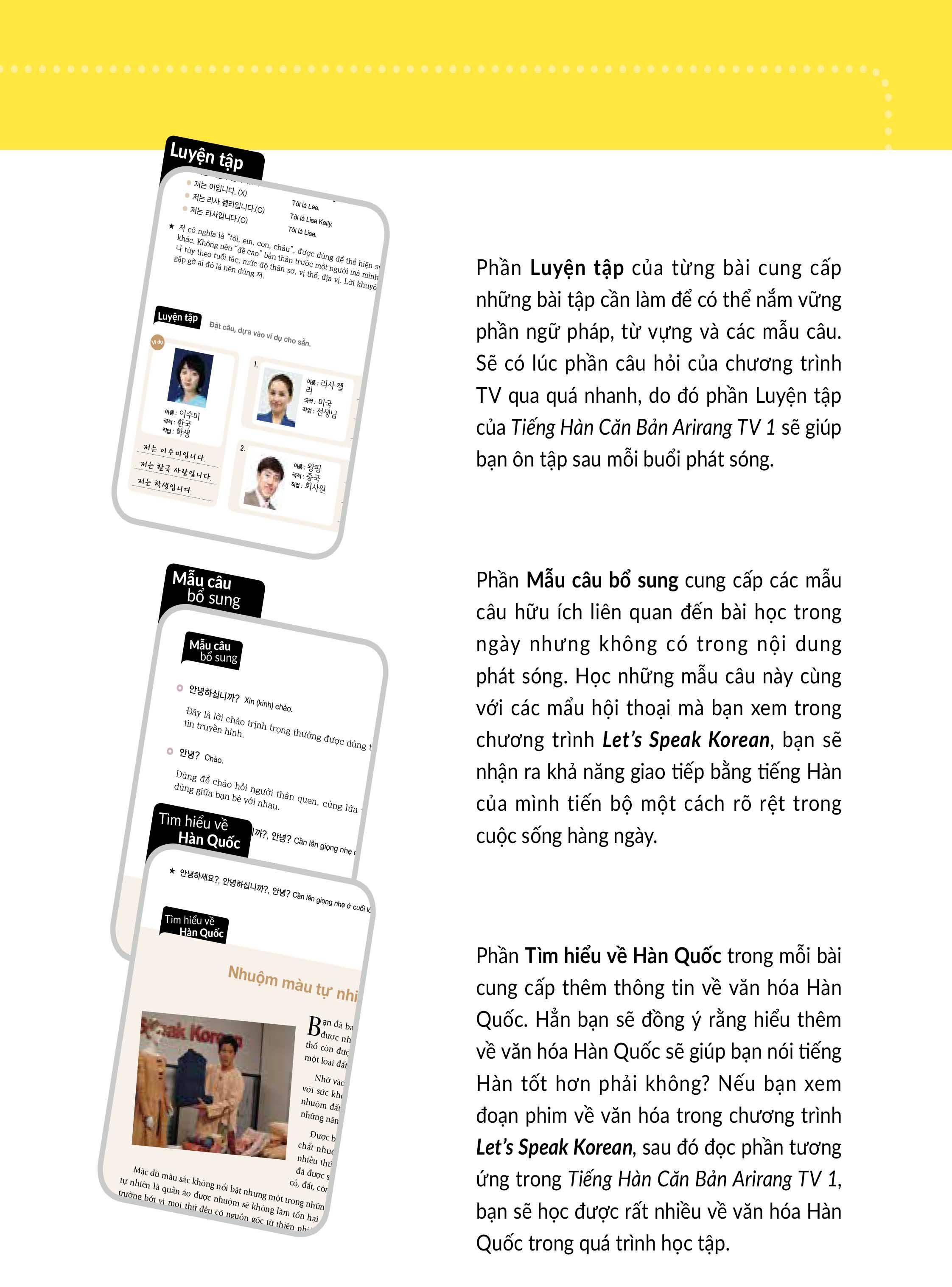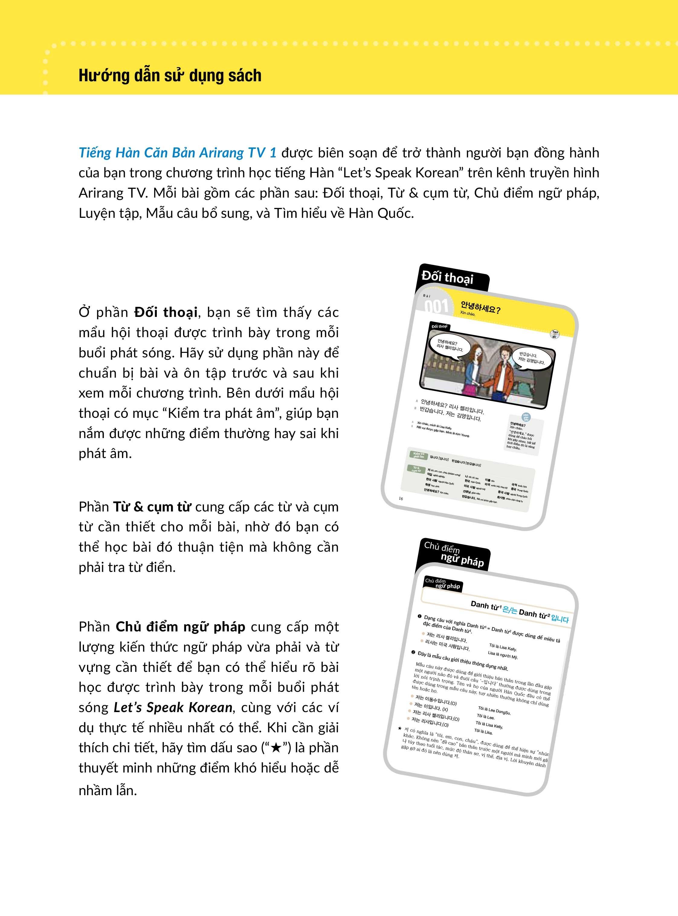 Bộ sách Tiếng Hàn Căn bản Arirang TV (Arirang Korean Basics) gồm hai cuốn, trải dài 130 bài học mẫu câu phổ biến nhất trong tiếng Hàn hằng ngày, mang đến cho bạn một trải nghiệm học tiếng Hàn thực tế, rất gần gũi với cách giao tiếp thường ngày của người Hàn.