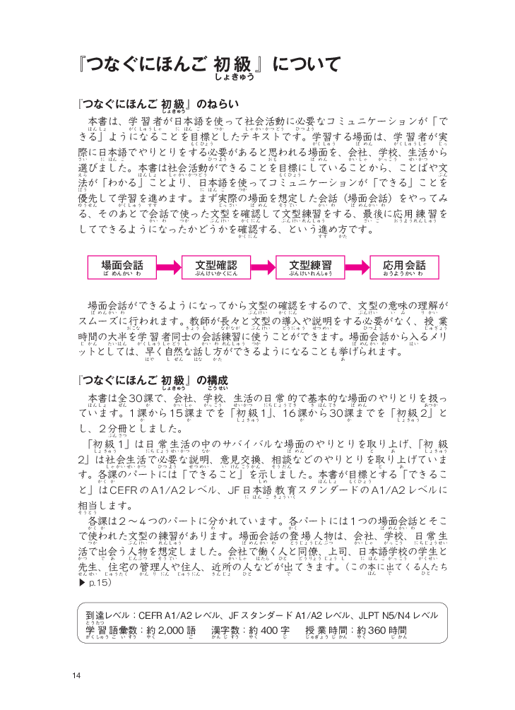 Giáo trình được biên soạn nhằm giúp người học giao tiếp bằng tiếng Nhật tốt hơn trong các hoạt động xã hội. Các tình huống học tập trong giáo trình là những tình huống thường được sử dụng để giao tiếp trên thực tế, được lựa chọn từ các lĩnh vực trong đời sống sinh hoạt, trường học và xã hội. Cách học được tổ chức theo hình thức đặc biệt ưu tiên việc "Giao tiếp" hơn là "Hiểu" từ vựng và ngữ pháp. [Hội thoại tình huống -> Xác nhận mẫu câu -> Luyện tập mẫu câu -> Hội thoại ứng dụng] Giáo trình bao gồm 2 sách giáo khoa sơ cấp 1, 2, hai quyển Work book sơ cấp 1,2 và 1 quyển Bản dịch và giải thích ngữ pháp.