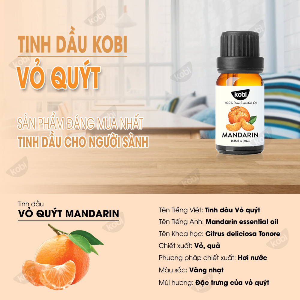 - Tư vấn nhiệt tình, thông tin rõ ràng, đầy đủ, giúp bạn an tâm khi lựa chọn. Thông tin chung về thực vật và tinh dầu Vỏ Quýt Kobi (Mandarin essential oil) Tên khoa học: Citrus deliciosa Tonore Xuất xứ: Ấn Độ. Phương pháp chiết xuất: Hơi nước. Bộ phận chiết xuất ra tinh dầu: Vỏ, quả Mùi hương: Mùi thơm đặc trưng mùi vỏ quýt Kết hợp tốt với các loại tinh dầu: Tinh dầu quýt phù hợp pha với các loại tinh dầu khác như: hoa cam, bưởi, cam, chanh, chanh sần, cam hương, vỏ quế, xô thơm