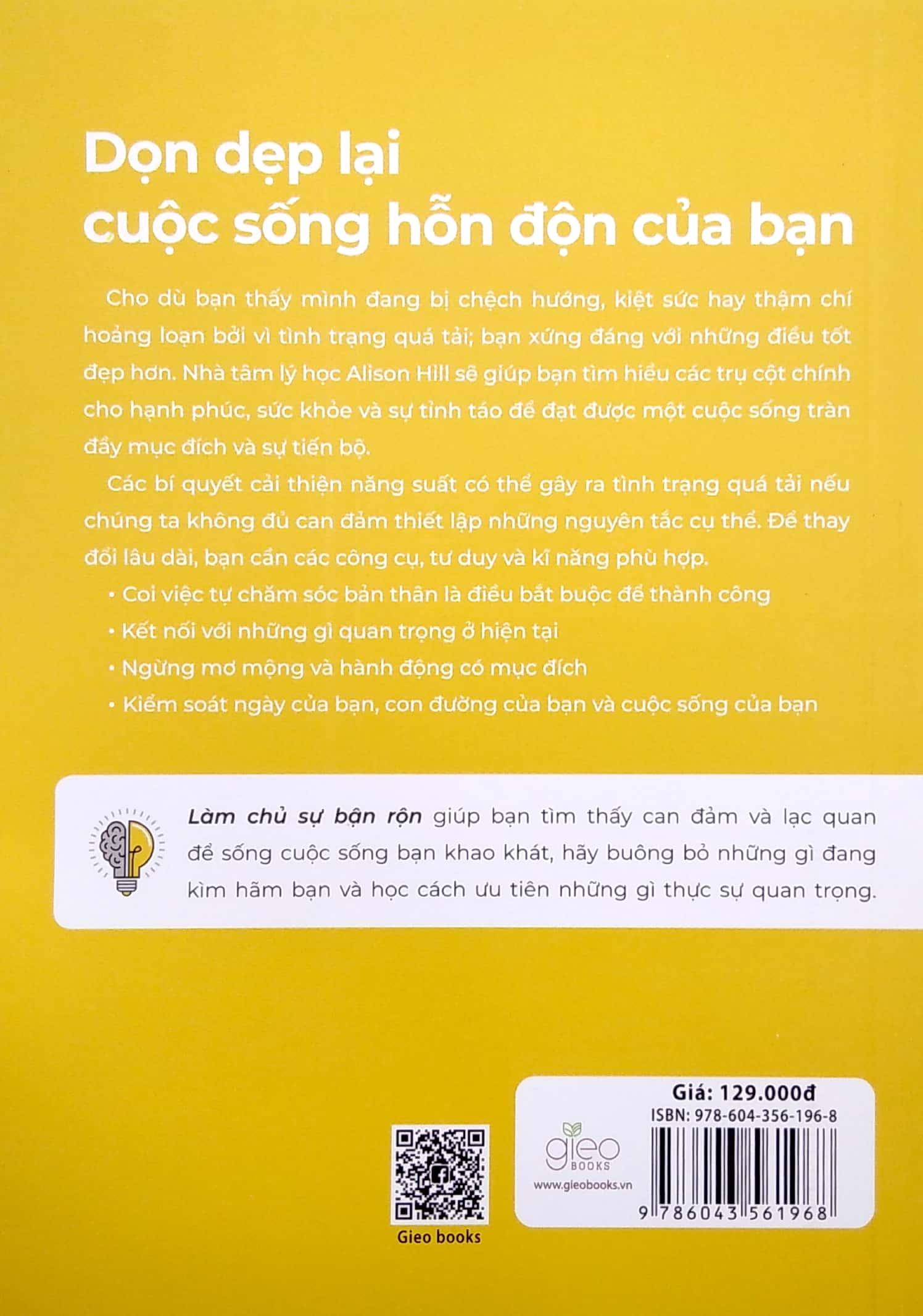 Làm chủ sự bận rộn giúp bạn tìm thấy can đảm và lạc quan để sống cuộc sống bạn khao khát, hãy buông bỏ những gì đang kìm hãm bạn và học hỏi cách để ưu tiên những gì thực sự quan trọng. Hãy ghi nhớ rằng sự bận rộn đang trở thành một huy hiệu danh dự, dù nó kì quặc, không thoải mái và không phù hợp với bất kì bộ trang phục nào của bạn; và “kiệt sức đã trở thành một biểu tượng trạng thái”. Chúng ta đang tham gia vào một cuộc đua trong đó người kiệt sức nhất sẽ là người chiến thắng. Vậy nên bạn hãy tự tìm thấy động lực để vực dậy và khởi động lại giữa mớ hỗn độn, để đón nhận những điều tốt đẹp nhất mà cuộc sống ban tặng.