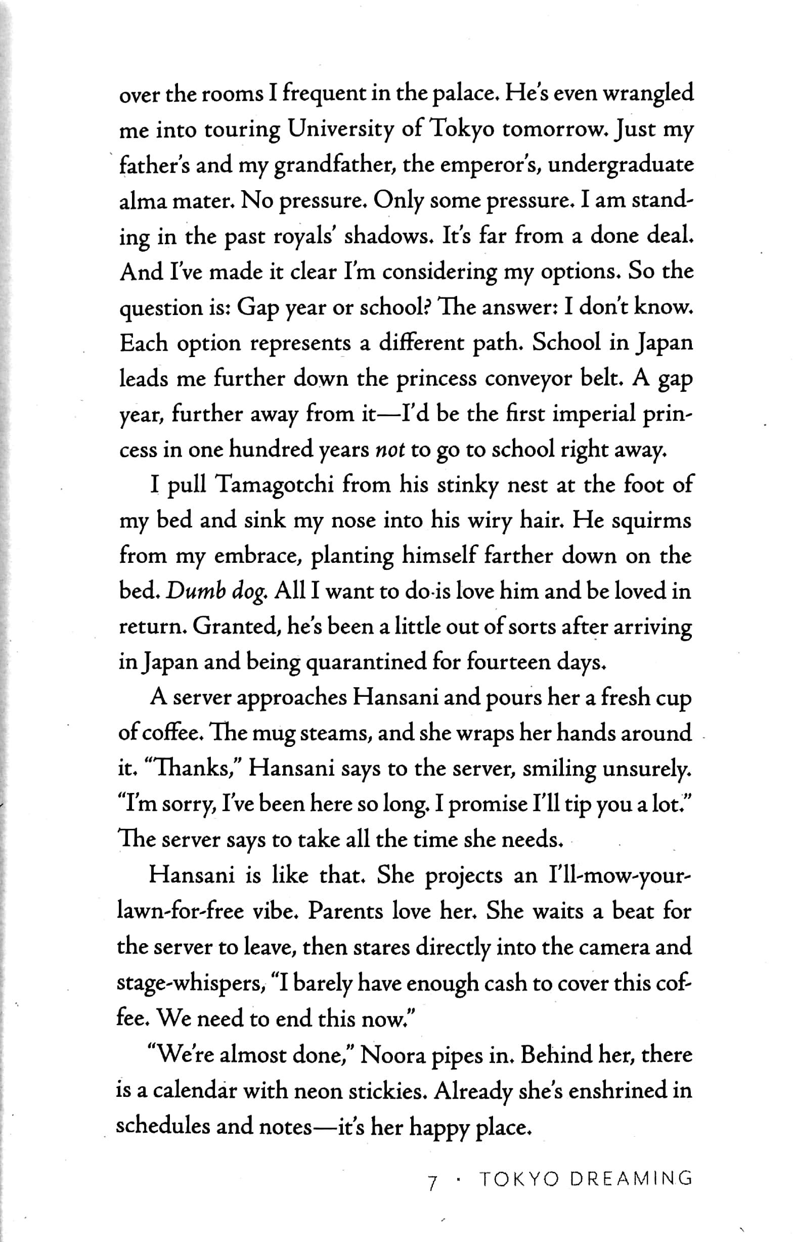 When Japanese-American Izumi Tanaka learned her father was the Crown Prince of Japan, she became a princess overnight. Now, she's overcome conniving cousins, salacious press, and an imperial scandal to finally find a place she belongs. She has a perfect bodyguard turned boyfriend. Her stinky dog, Tamagotchi, is living with her in Tokyo. Her parents have even rekindled their college romance and are engaged. A royal wedding is on the horizon! Izumi's life is a Tokyo dream come true. O