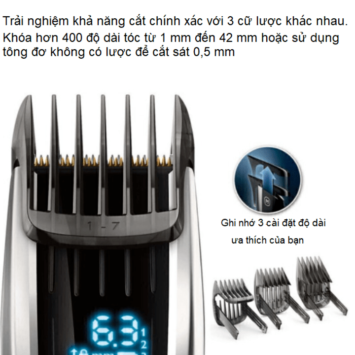 - Nhớ 3 chế độ cài đặt độ dài trên mỗi cữ lược Công nghệ DualCut để cắt nhanh hơn, sắc nét hơn