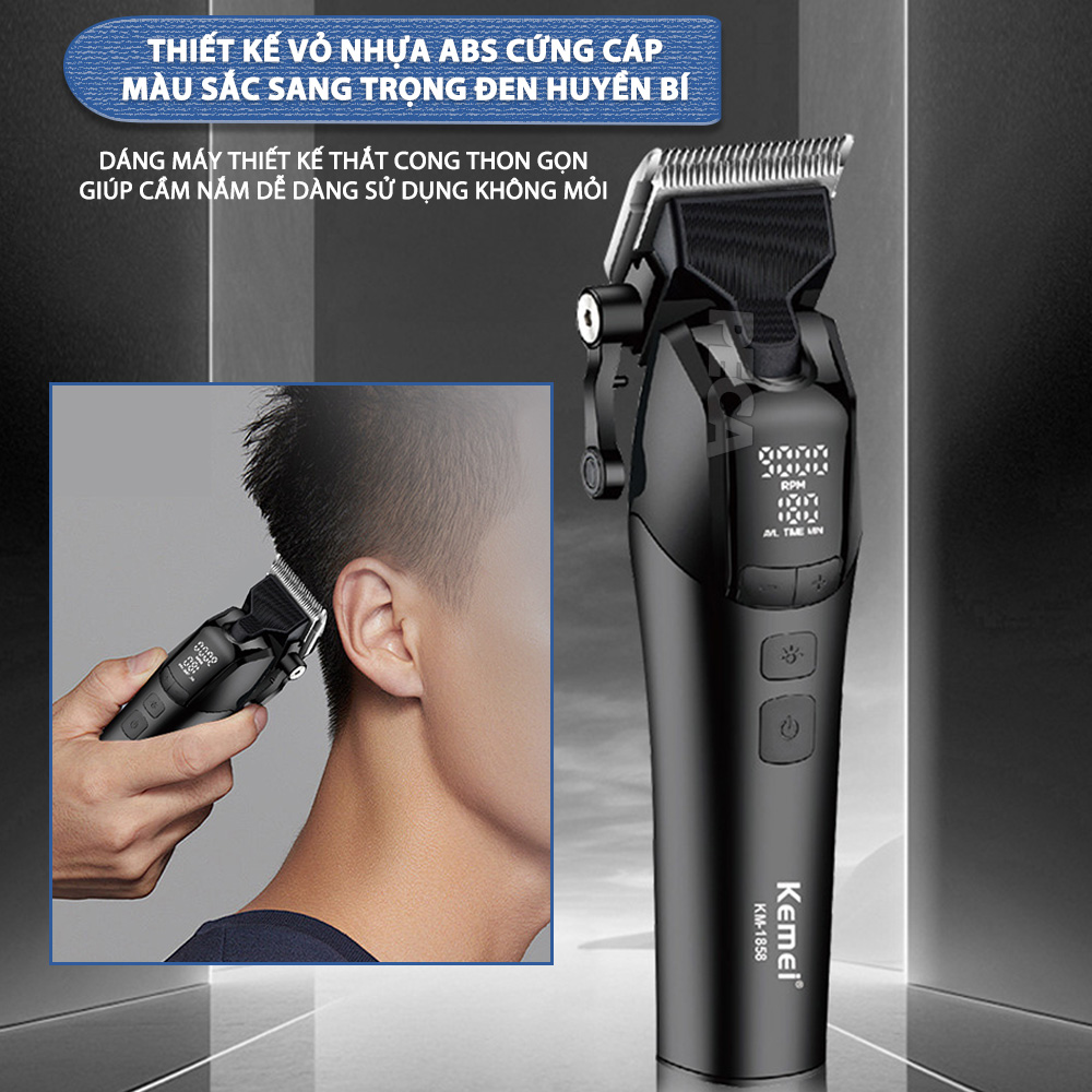 TÔNG ĐƠ CẮT TÓC CHUYÊN NGHIỆP KEMEI KM-1858 CÔNG SUẤT MẠNH 10W, MÀN HÌNH LCD HIỂN THỊ, LƯỠI CẮT MẠ CARBON DLC CAO CẤP