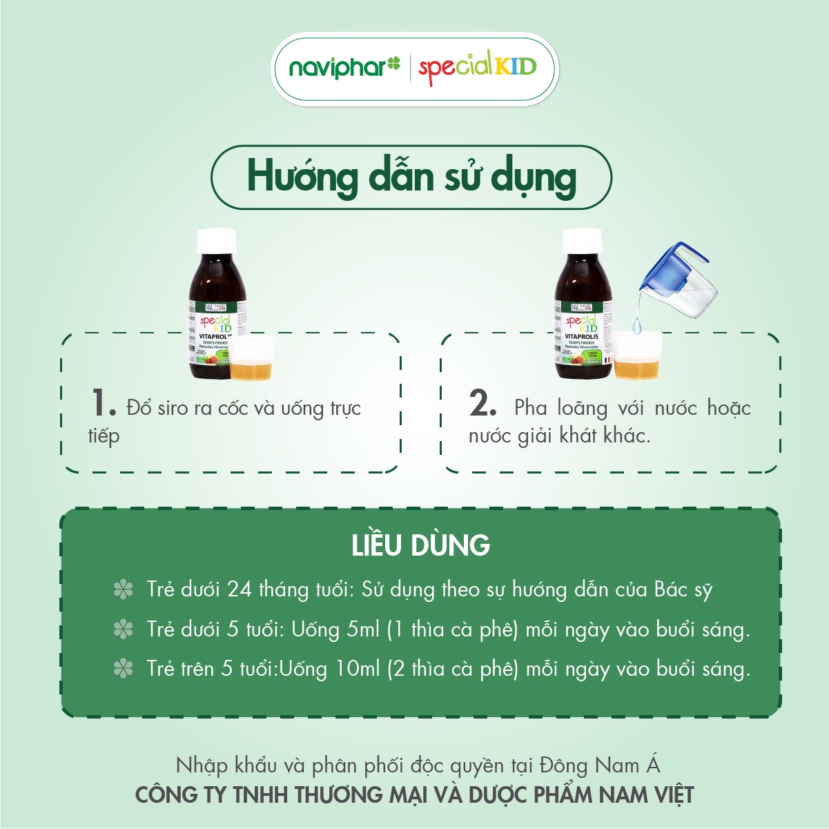 Trẻ trên 5 tuổi : Uống 10ml (2 thìa cà phê) mỗi ngày vào buổi sáng.