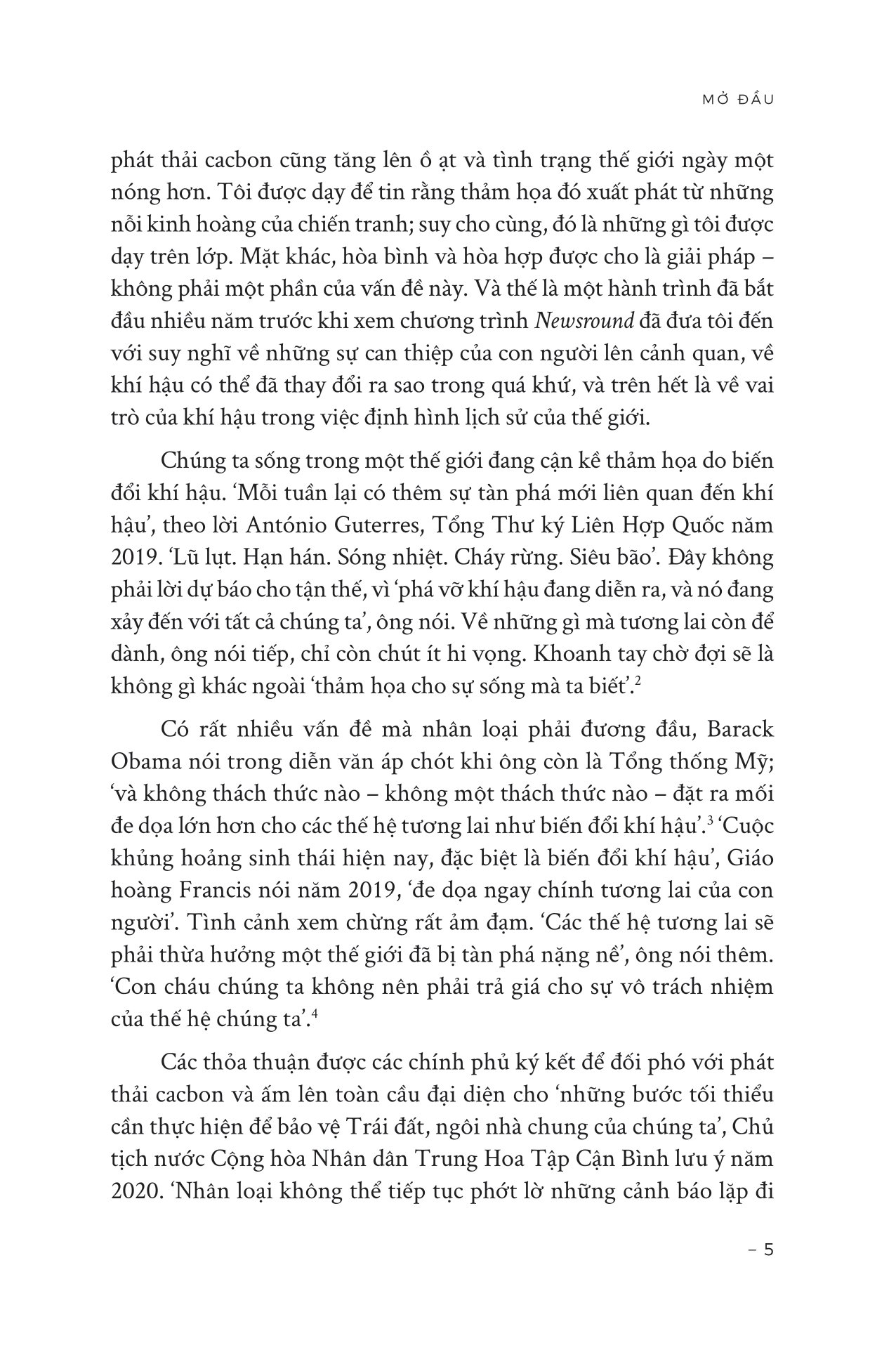 Ban đầu, tôi nghĩ mình sẽ chỉ viết về lịch sử, rằng khí hậu đã định hình thế giới quanh ta như thế nào, và về những chiều hướng mà những biến chuyển trong nhiệt độ toàn cầu, lượng mưa và mực nước biển – cùng những hiện tượng cực đoan, như siêu bão, núi lửa phun trào và va chạm thiên thạch – đã ảnh hưởng lên quá khứ, sắp đặt nên những khoảnh khắc, những thời kỳ và bối cảnh giải thích vai trò quan trọng đến nhường nào của khí hậu trong lịch sử thế giới.