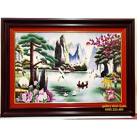 TRANH ĐÁ QUÝ - PHONG CẢNH NON NƯỚC HỮU TÌNH Tranh được chế tác hoàn toàn thủ công bằng vật liệu từ đá quý tự nhiên 100% Khung tranh vân gỗ nhựa composite cao cấp , bền đẹp . Mặt tranh được bảo vệ lớp kính hoặc mika trong. Kích thước phủ khung 80*110CM Tranh phù hợp treo phòng khách , treo phong thủy hoặc làm quà mừng thọ , chúc thọ , khao lão Vật liệu đá làm tranh gồm các loại dưới đây. Trắng: Canxit. Đen: Tourmaline, Thiên Thạch . Tím: Thạch anh tím . Đỏ, hồng: Ruby, Garnet . Vàng, vàng rơm: Thạch anh vàng, Opal vàng. Xanh đậm, xanh xám, xanh đen: Saphire xanh đen. Xanh lá cây, xanh lông công: Opal xanh, đá Khổng Tước. Xanh lơ, xanh nước, xanh bầu trời: Sapphire xanh lơ, Opal xanh lơ. Các màu sắc khác: Pha màu bằng các công thức đặc trưng hoặc tùy biến.