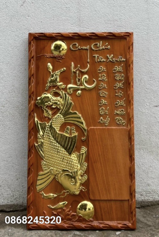 Tranh gỗ hương đục nổi mạ vàng - CẶP CÁ CHÉP -LÝ NGƯ VỌNG NGUYỆT Chất liệu gỗ hương liền khổi đục nổi 5D kênh bong , cực tinh xảo, mạ vàng sơn pu cao