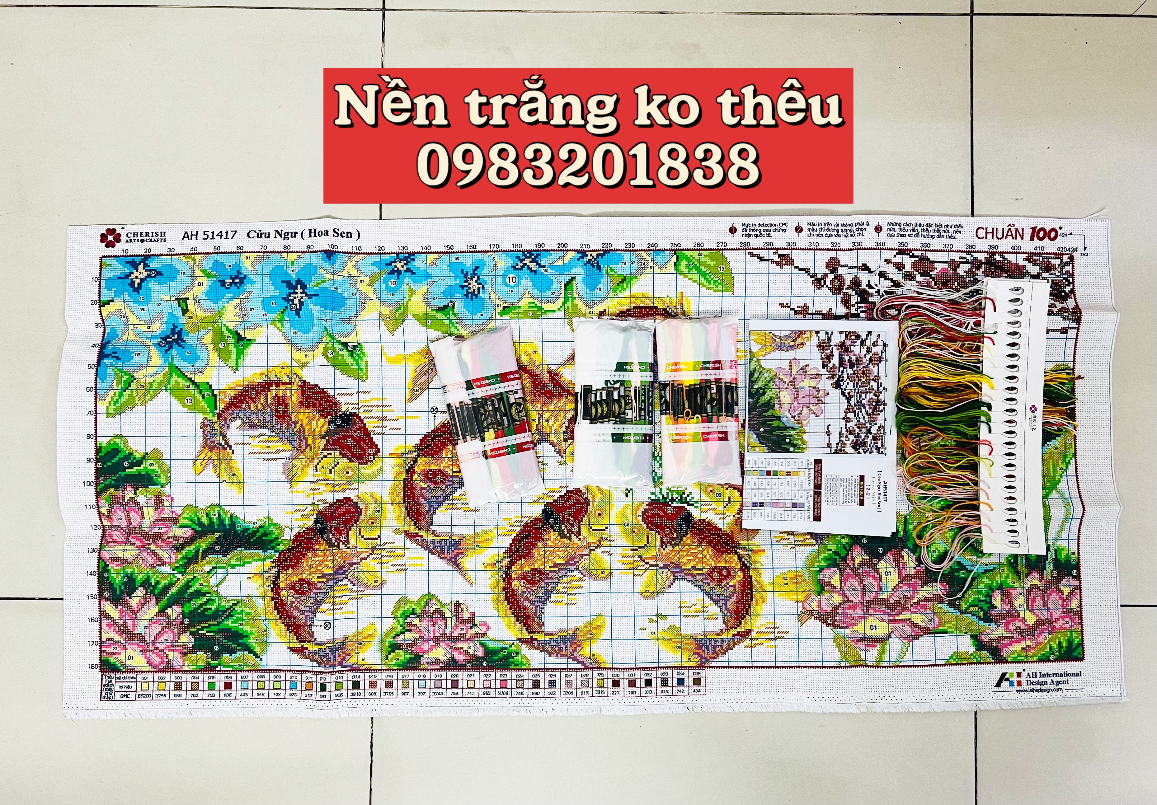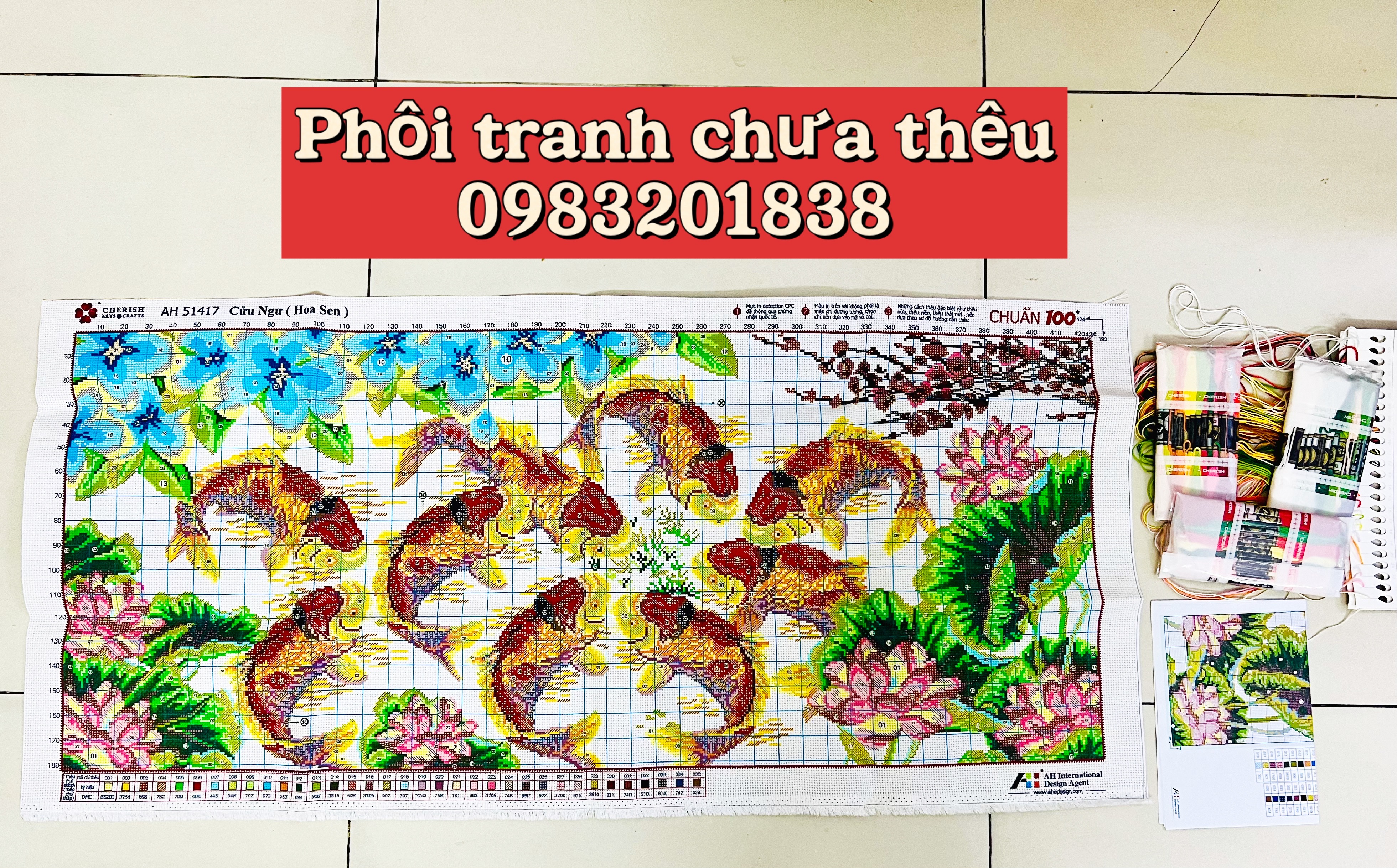 ✨Tranh thêu chữ thập Cửu ngư hoa sen AL51417, nền trắng không thêu, kích thước 108 x 52 cm