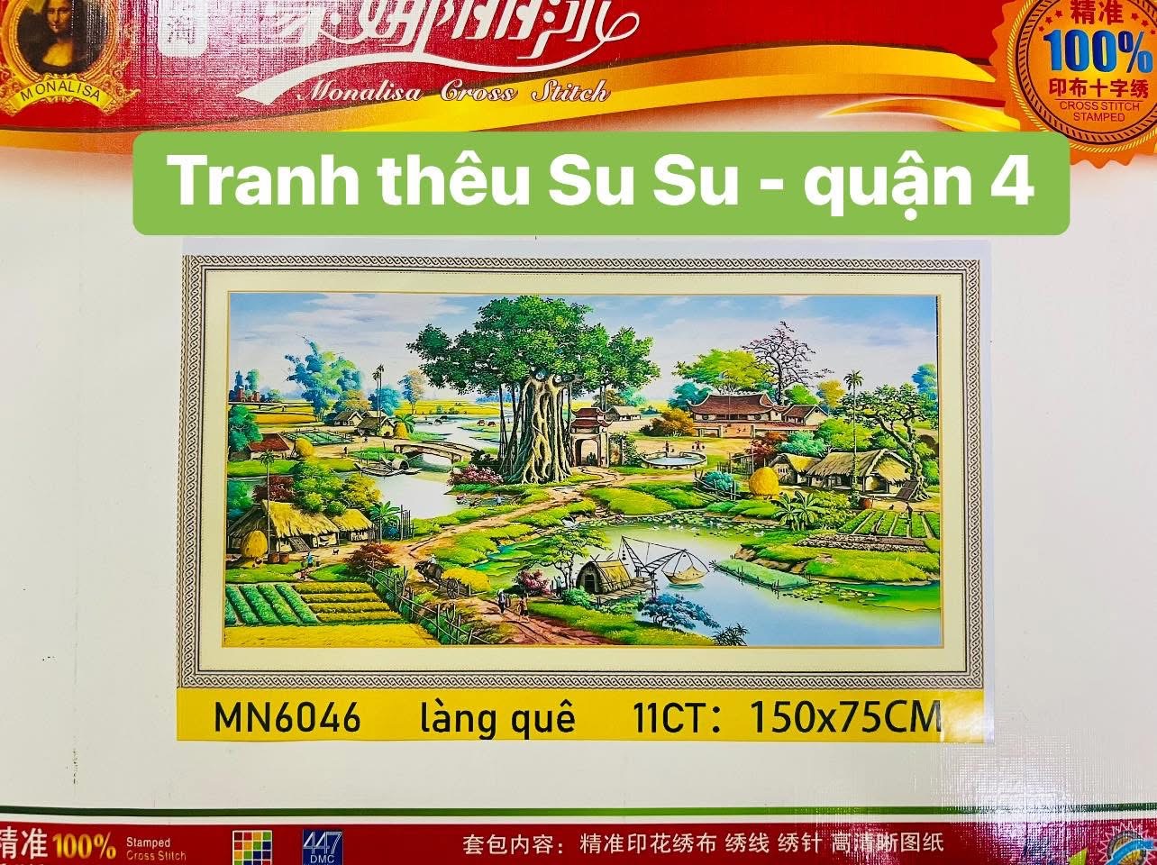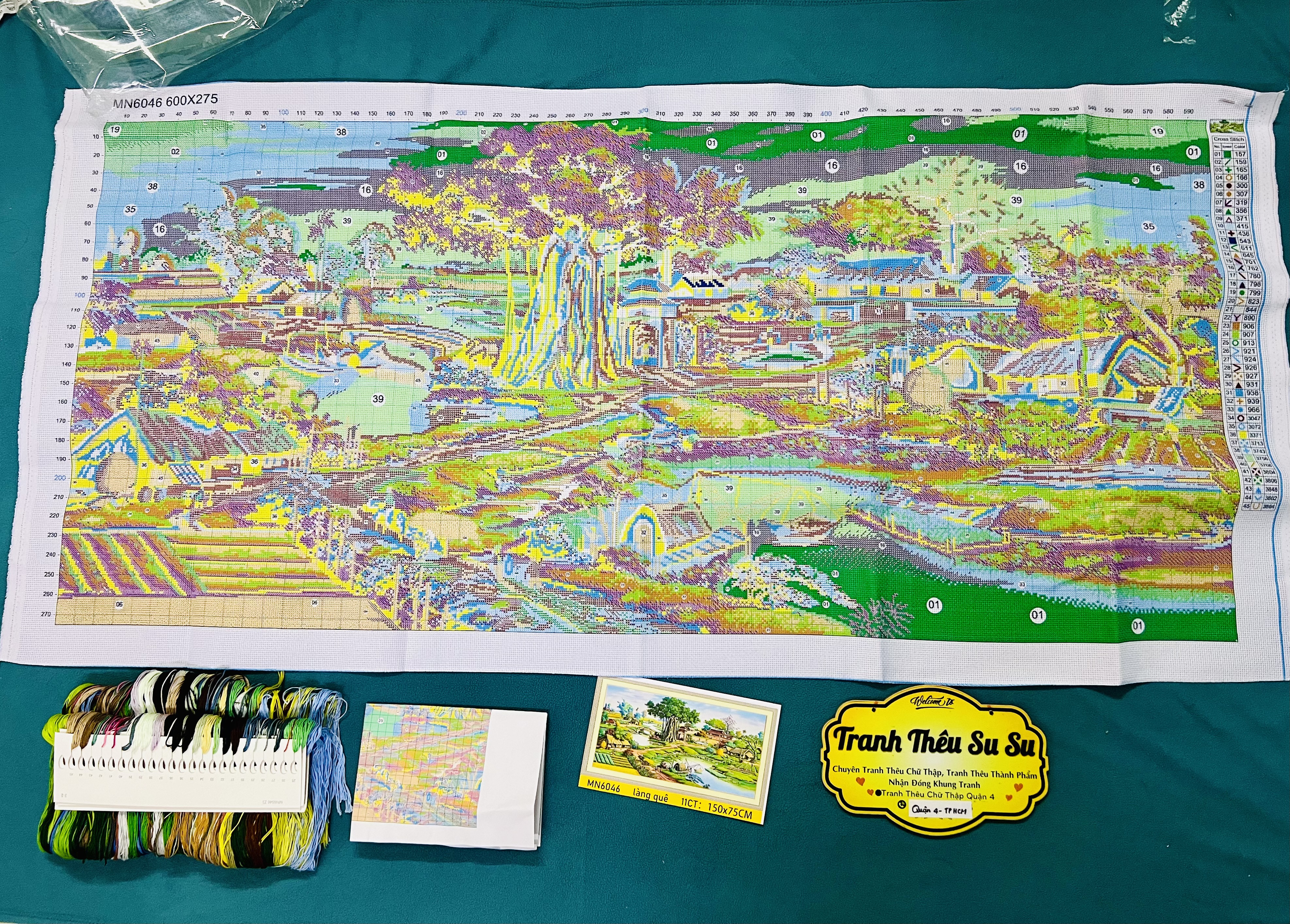 Tên tranh: Tranh thêu kín Phong cảnh làng quê Thể loại: Tranh thêu chữ thập (sản phẩm này là tranh chưa thêu). Kích thước: 50 x 60 cm Phần khách cần thêu trên tranh: thêu
