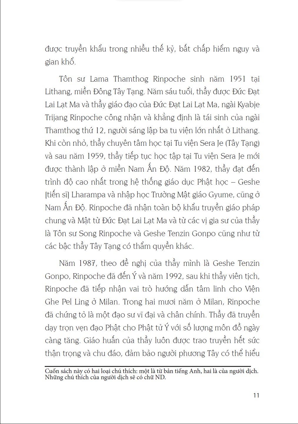 Tôn sư Lama Thamthog Rinpoche thuộc dòng tái sinh Thamthog. Thầy sinh tại miền Đông Tây Tạng vùng Lithang. Khi lên năm tuổi, giáo thọ của Đức Đạt Lai Lạt Ma – Trijang Rinpoche – đã nhận ra Thầy là Thamthog Rinpoche thứ 13. Thầy học triết học tại Tu viện Sera Je ở Lhasa. Giáo thọ của Đức Đạt Lai Lạt Ma, Ling Rinpoche đã ban giới Sa Di (tiếng Tạng là Getsul) cho thầy. Thầy cũng nhận Pháp từ Đức Đạt Lai Lạt Ma ở Lhasa. Những Pháp đầu tiên là lam rim và Kalachakra.