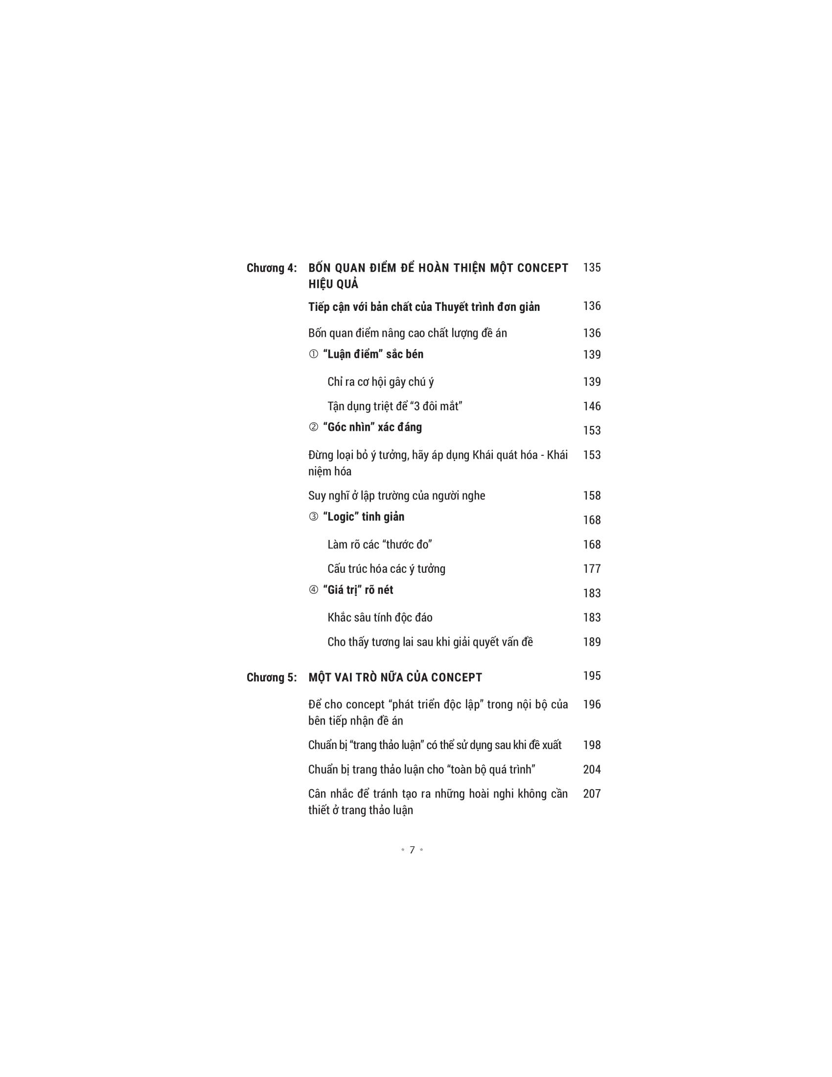 Chìa khóa cho vấn đề nằm ở việc nắm vững tư duy cũng như kỹ thuật để xây dựng ý tưởng chủ đạo, tạo ra các giá trị tiềm năng cho người nghe, đồng thời truyền tải chúng một cách ngắn gọn nhưng hiệu quả. Khi trình bày thuyết phục rành mạch, với kế hoạch rõ ràng xác đáng cùng kết quả thực tế khả thi, chắc chắn đề xuất của bạn sẽ dẽ dàng “chạm đích”. Cuốn sách với sáu chương ngắn gọn tập trung vào một kỹ thuật được gọi là «Thuyết trình đơn giản », một kỹ thuật cân bằng giữa việc tạo ra giá trị hấp dẫn và việc trình bày nó một cách rõ ràng dễ hiểu.