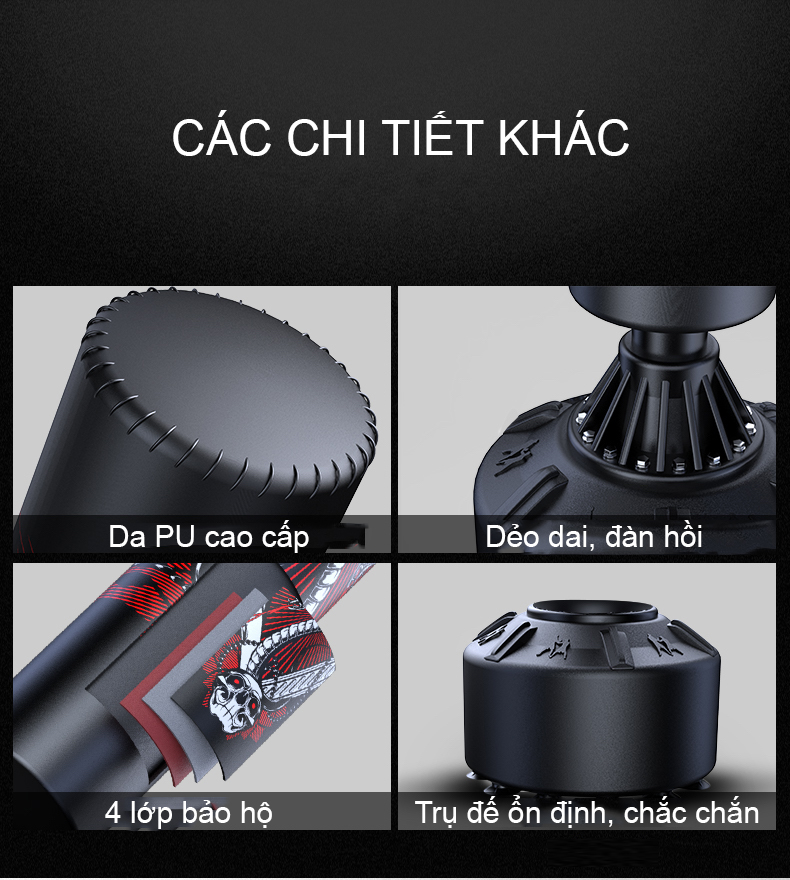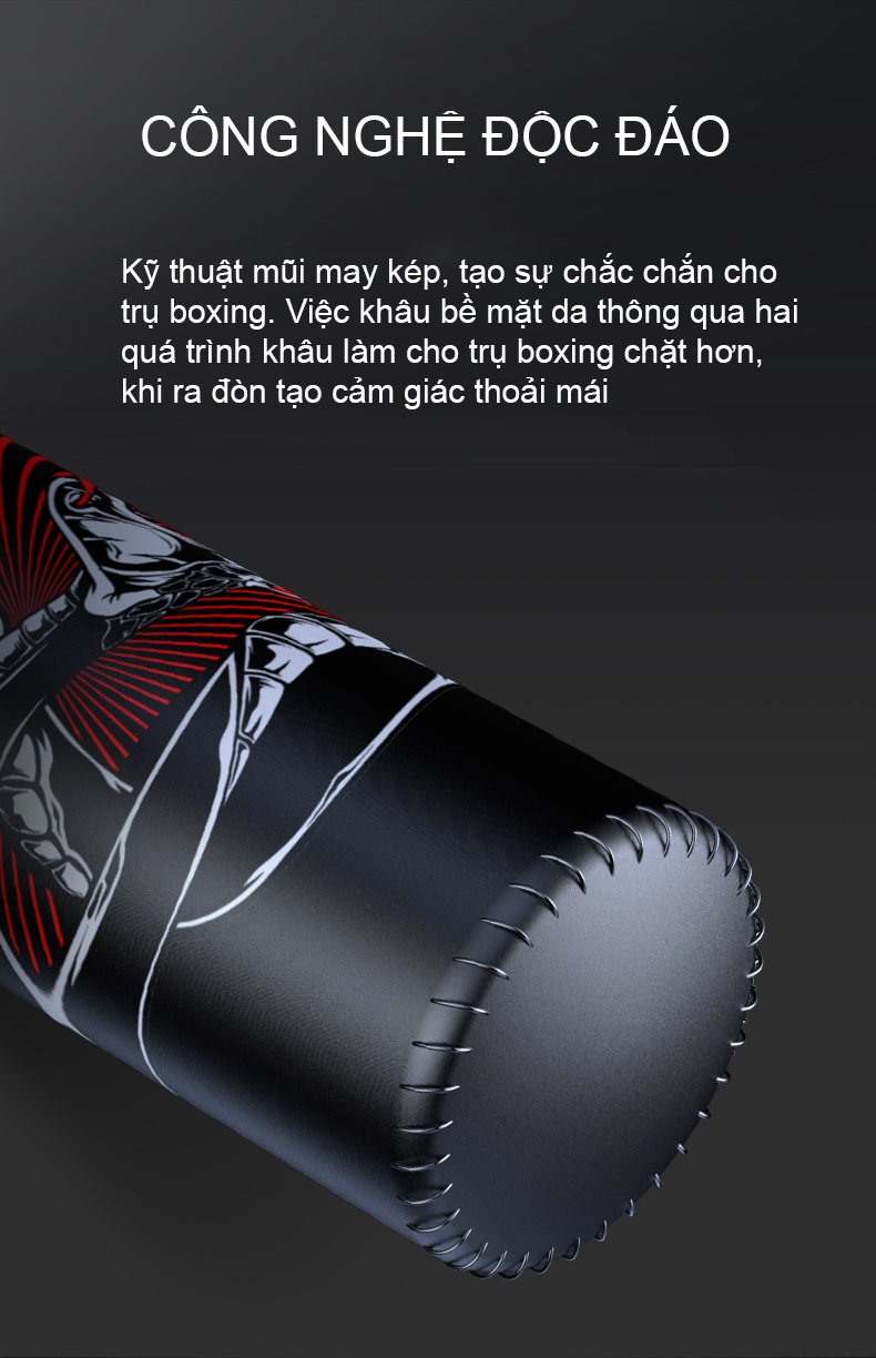 Trụ Đấm Bốc Tự Đứng Thế Hệ Mới được thiết kế với thân vỏ ngoài được bọc bằng da PU 4 lớp,bên trong là ruột mút đàn hồi kết hợp lớp đệm giảm lực và lớp xốp trân châu EP giúp người tập không bị đau tay.