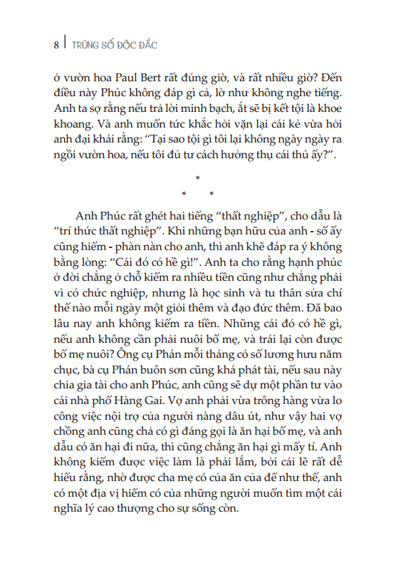 Tiểu thuyết Trúng Số Độc Đắc là tác phẩm lớn của Vũ Trọng Phụng cũng như của cả nền văn xuôi Việt Nam hiện đại. Với nghệ thuật trần thuật đặc sắc đầy khả năng biến hoá, với ngôn ngữ và giọng điệu hài hước, trào phúng, ông đã dựng lên hàng loạt nhân vật "đồ vật hoá", nhân vật "kịch", nhân vật trào phúng, chân dung biếm họa có ý nghĩa xã hội sâu sắc.