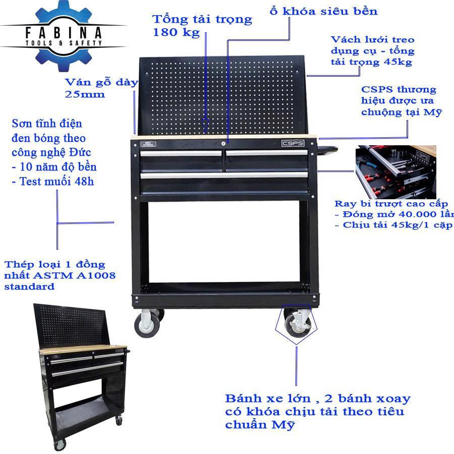 Tủ dụng cụ CSPS 7 ngăn kéo, mặt ván gỗ và vách lưới chất lượng cao. THÔNG SỐ KỸ THUẬT 1 THÔNG SỐ CHUNG Kích thước sản phẩm: 76.4 cm Ngang x 46.2cm Sâu x 96