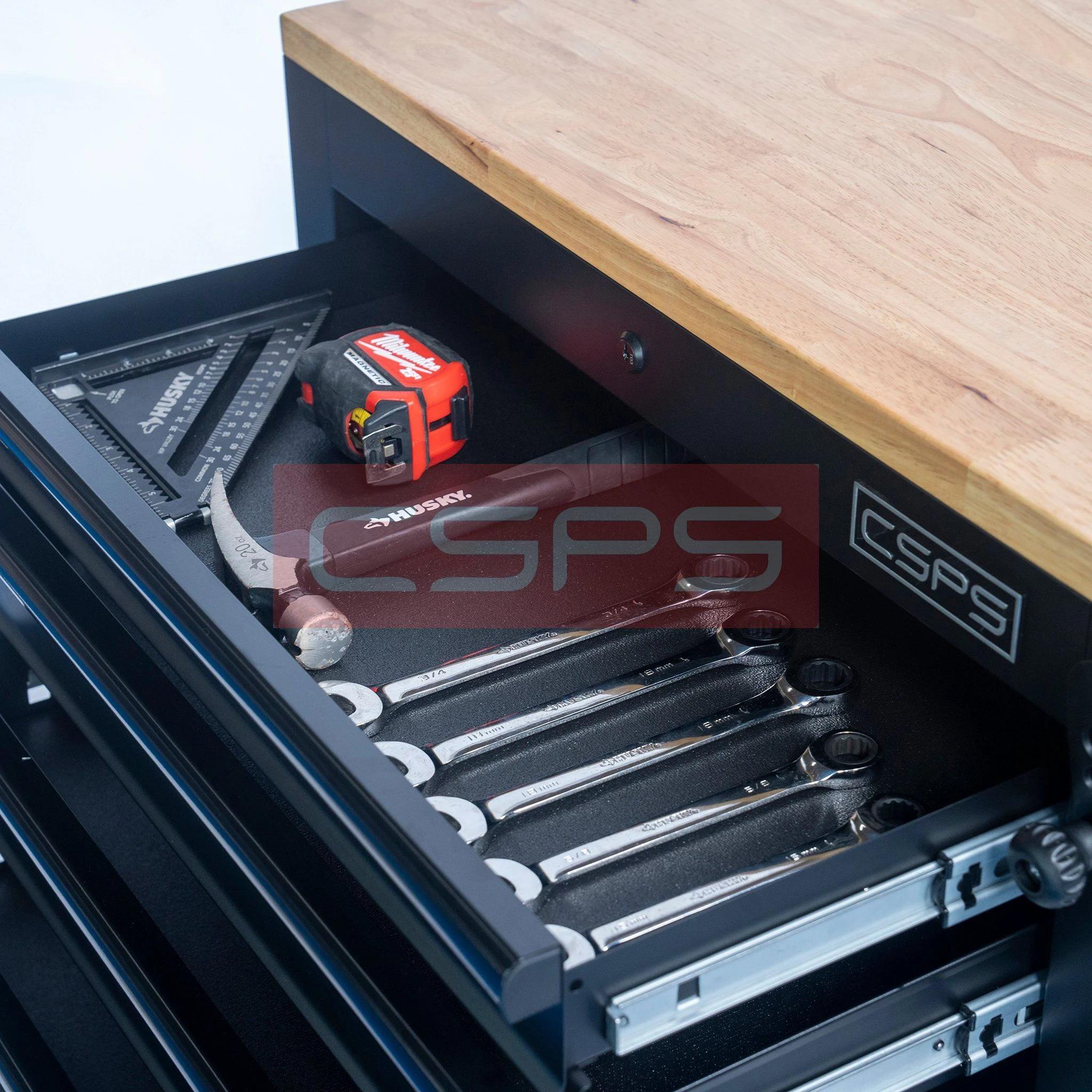 Tủ dụng cụ 7 ngăn kéo có mặt ván gỗ kèm ray đóng êm CSPS THÔNG SỐ KỸ THUẬT 1) THÔNG SỐ CHUNG Kích thước sản phẩm: 76,5 cm W x 46,2 cm D x
