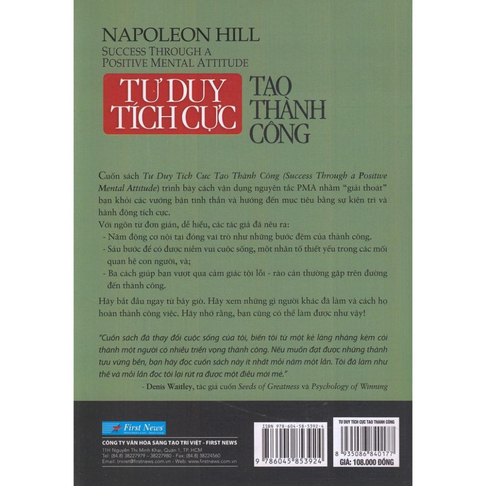 Tư duy tích cực tạo thành công giúp khẳng định một sự thật rằng: với thái độ tích cực, bất kỳ ai cũng có thể biến giấc mơ của mình thành hiện thực. Tư duy tích cực tạo thành công (Success Through a Positive Mental Attitude) trình bày cách vận dụng nguyên tắc PMA nhằm “giải thoát” bạn khỏi các vướng bận tinh thần và hướng đến mục tiêu bằng sự kiên trì và hành động tích cực.