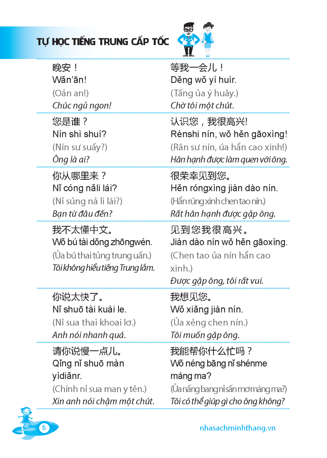 Cuốn sách “Tự học tiếng Trung cấp tốc” dành cho những đối tượng mới tiếp xúc với tiếng Trung. Cuốn sách bao gồm 32 bài ứng với 32 chủ đề giao tiếp quen thuộc gắn với cuộc sống hàng ngày như: chào hỏi, giới thiệu, làm quen, hỏi đường, mua sắm, gọi điện thoại, đi xe taxi, ở khách sạn, nhà hàng, bưu điện, ngân hàng…