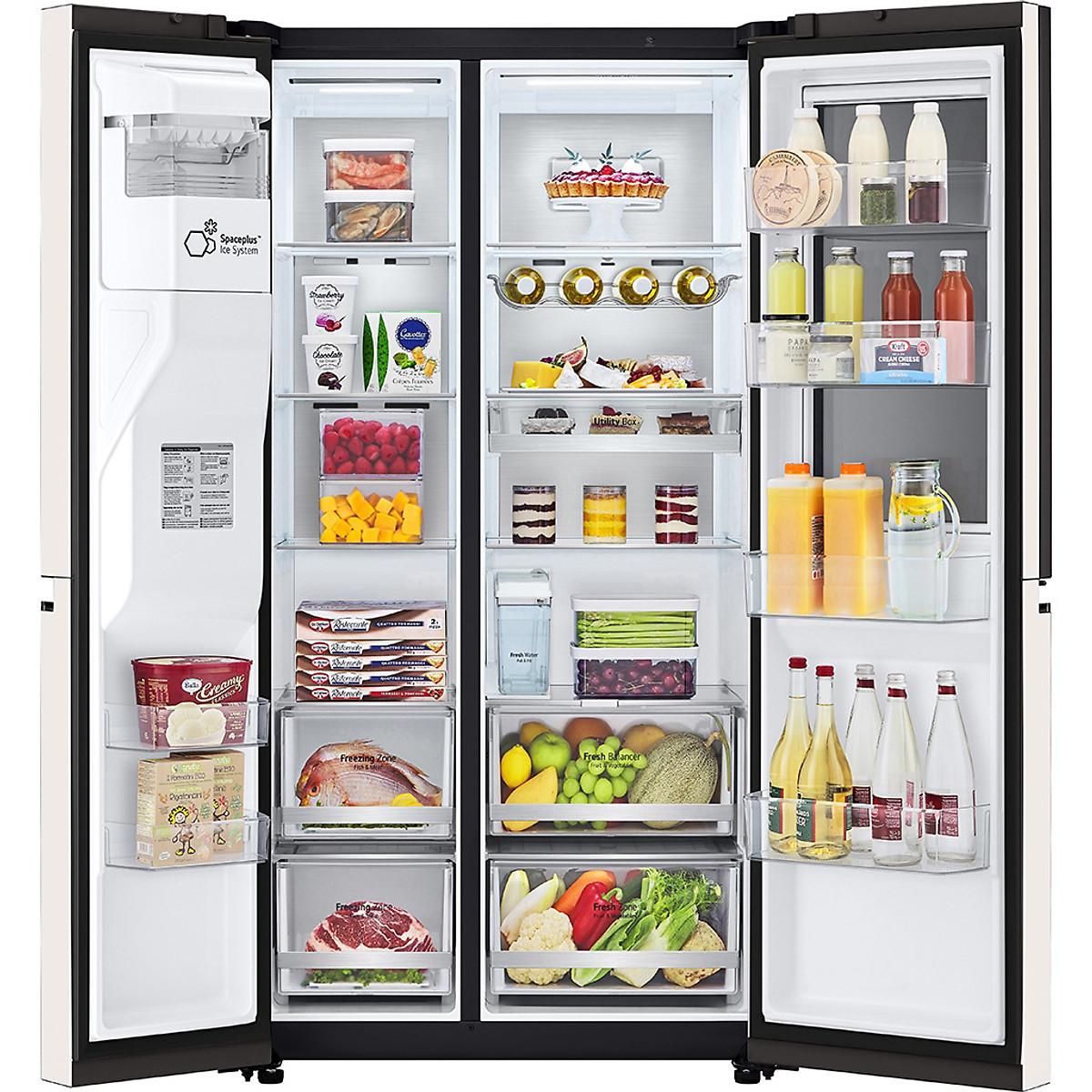 - ĐƯỢC KHUI THÙNG KIỂM TRA sản phẩm trước khi thanh toán/ký nhận Đặc điểm sản phẩm Model: GR-X257BG Màu sắc: Be Nhà sản xuất: LG Xuất xứ: Trung Quốc Năm ra mắt : 2023 Kiểu tủ lạnh: Side by side Số cửa tủ: 2 cửa Dung tích tủ lạnh: 674 L Dung tích sử dụng: 635 L Dung tích ngăn đá: 219 L Dung tích ngăn lạnh: 416 L Đóng tuyết: Không Chất liệu khay: Kính cường lực Công nghệ làm lạnh: LINEARCooling, DoorCooling+ Công nghệ bảo quản thực phẩm: FRESHBalancer Kháng khuẩn / Khử mùi: Hygiene Fresh+ Chất liệu bên ngoài: PCM Màu Be Công nghệ Inverter: Có Inverter Làm đá tự động: Máy làm đá tự động (Spaceplus), làm đá viên, đá nghiền Lấy nước bên ngoài: Có Điện năng tiêu thụ: 688 kWh/năm (2 sao) Kết nối Wifi: Wifi ThinQ Tiện ích khác: Chuẩn đoán thông minh (Smart Diagnosis); Đông nhanh (Express Freeze); Hộp tiện ích (Utility Box), giá đựng rượu, hộp đựng rau; Khóa trẻ em (Child lock); Cảnh báo cửa (Door alarm) Khối lượng sản phẩm (kg): 131 kg Kích thước sản phẩm: 913x735x1790 mm Ngăn đá