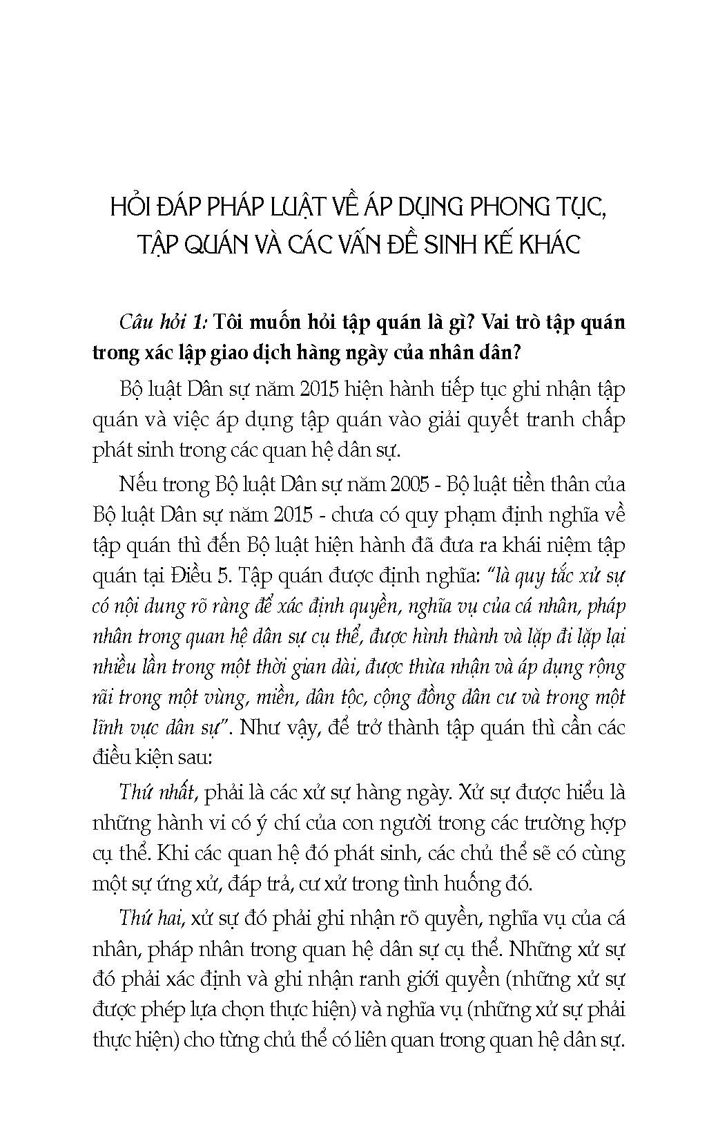 Cuốn sách trọng tâm giới thiệu về tập quán được pháp luật thừa nhận với tư cách là một nguồn quan trọng trong giải quyết các tranh chấp phát sinh. Thông qua các tình huống, câu hỏi, tác giả muốn giới thiệu những khía cạnh lý luận, làm rõ các điều kiện pháp luật đặt ra để áp dụng tập quán cũng như cho thấy vai trò tập quán trong quá trình giải quyết các tranh chấp của đời sống con người, đặc biệt những tranh chấp dân sự phát sinh trong đời sống hàng ngày. Đồng thời, tác giả cũng đưa ra các khía cạnh để đối sánh giữa tập quán với phong tục, luật tục, thói quen ứng xử.