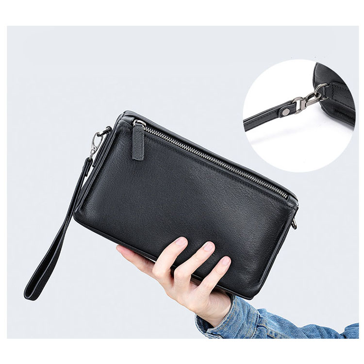 Kích thước dài 25cm dày 6.5cm cao 15cm với 2 ngăn khóa chính, thêm ngăn nhỏ và khe cài thẻ card giúp bạn nam thoải mái đeo và để đồ.