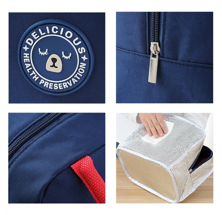Bên ngoài là lớp vải oxford, có ngăn đựng thìa đũa, bên trong là lớp lót giấy bạc giữ nhiệt hiệu quả.