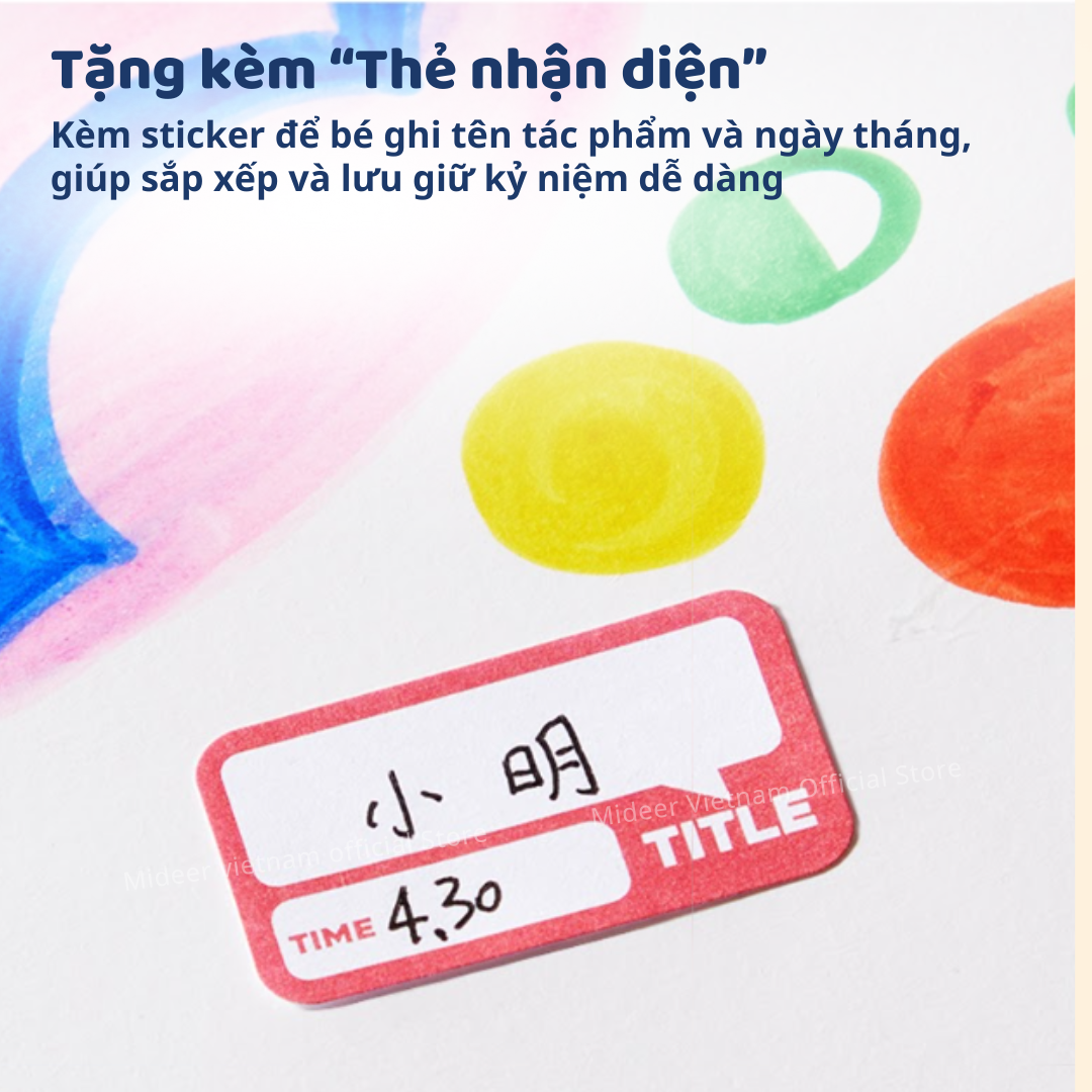 Kèm theo các sticker để bé ghi tên tác phẩm và ngày tháng, giúp việc sắp xếp và ghi chú mỗi kỷ niệm trở nên dễ dàng hơn bao giờ hết.